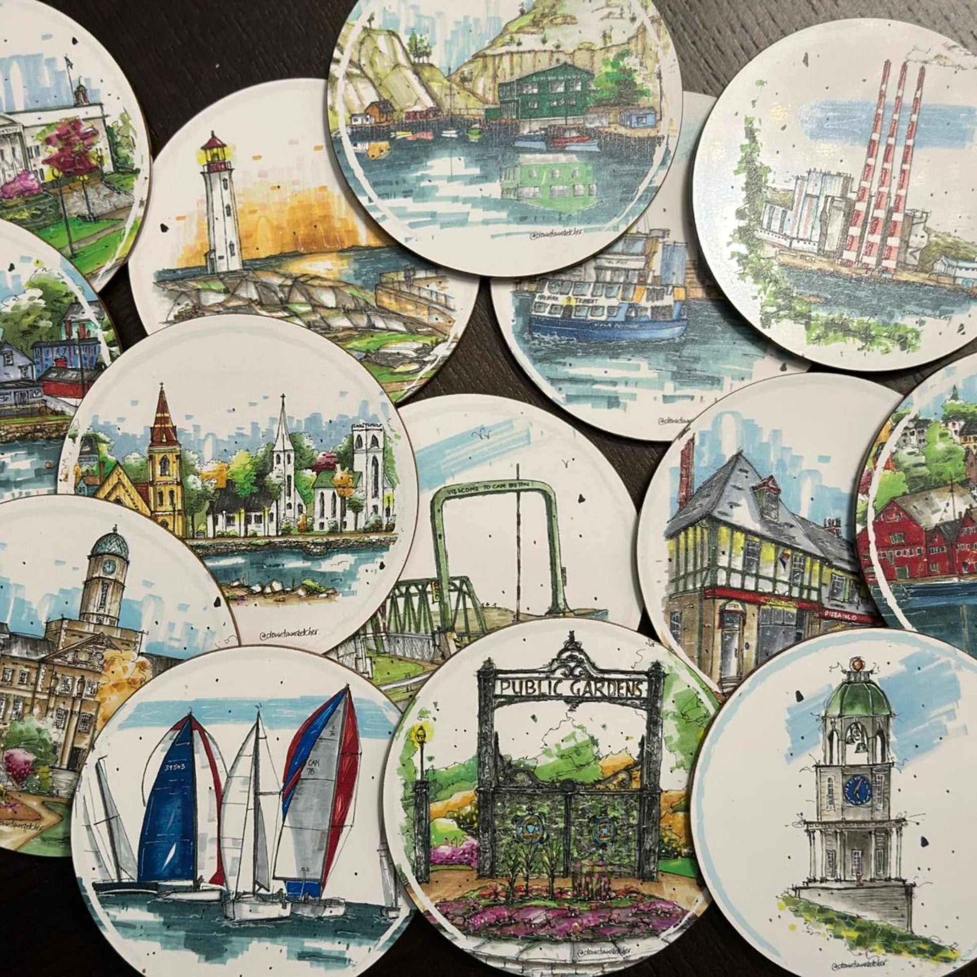 These delightful coasters feature hand-drawn sketches lovingly capturing the essence of local landmarks, storefronts, and iconic eateries. With their practical cork backing, they make the perfect gift for loved ones or a delightful addition to your own home or office - bringing the region's beauty and maritime spirit to your daily routine.