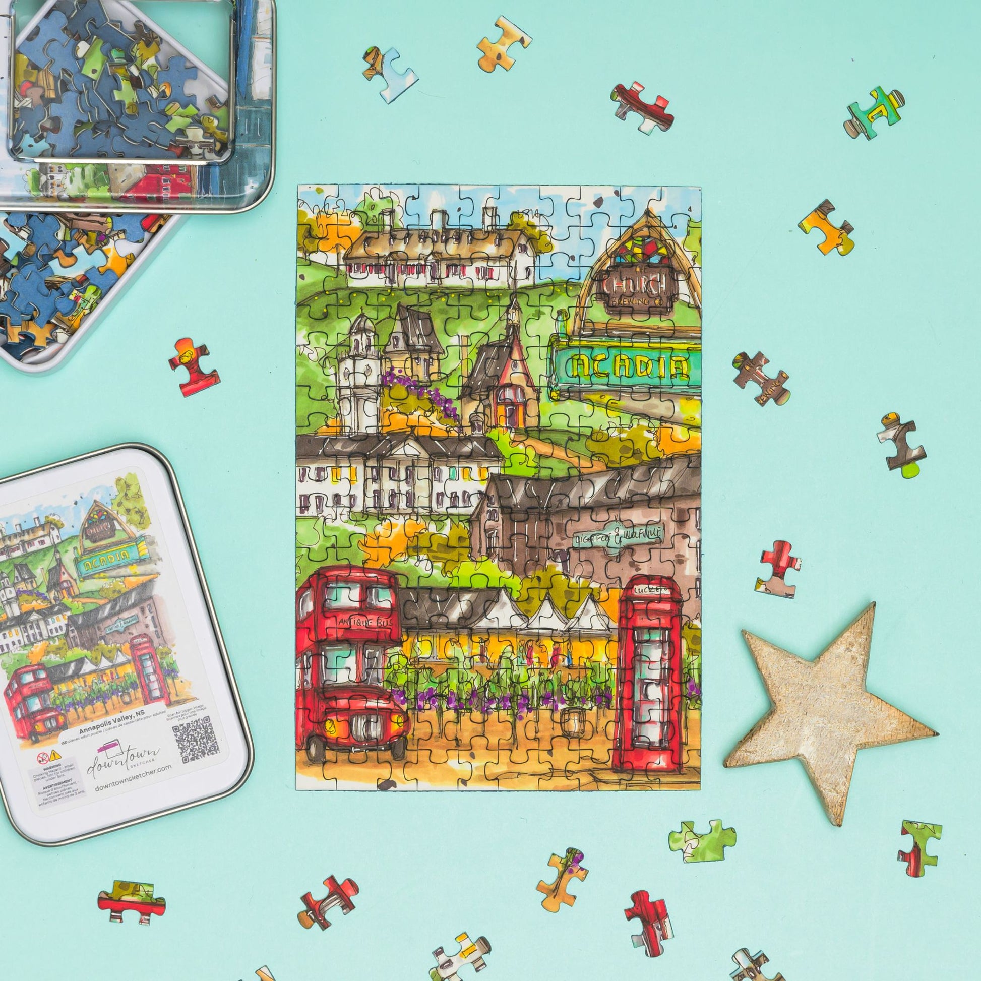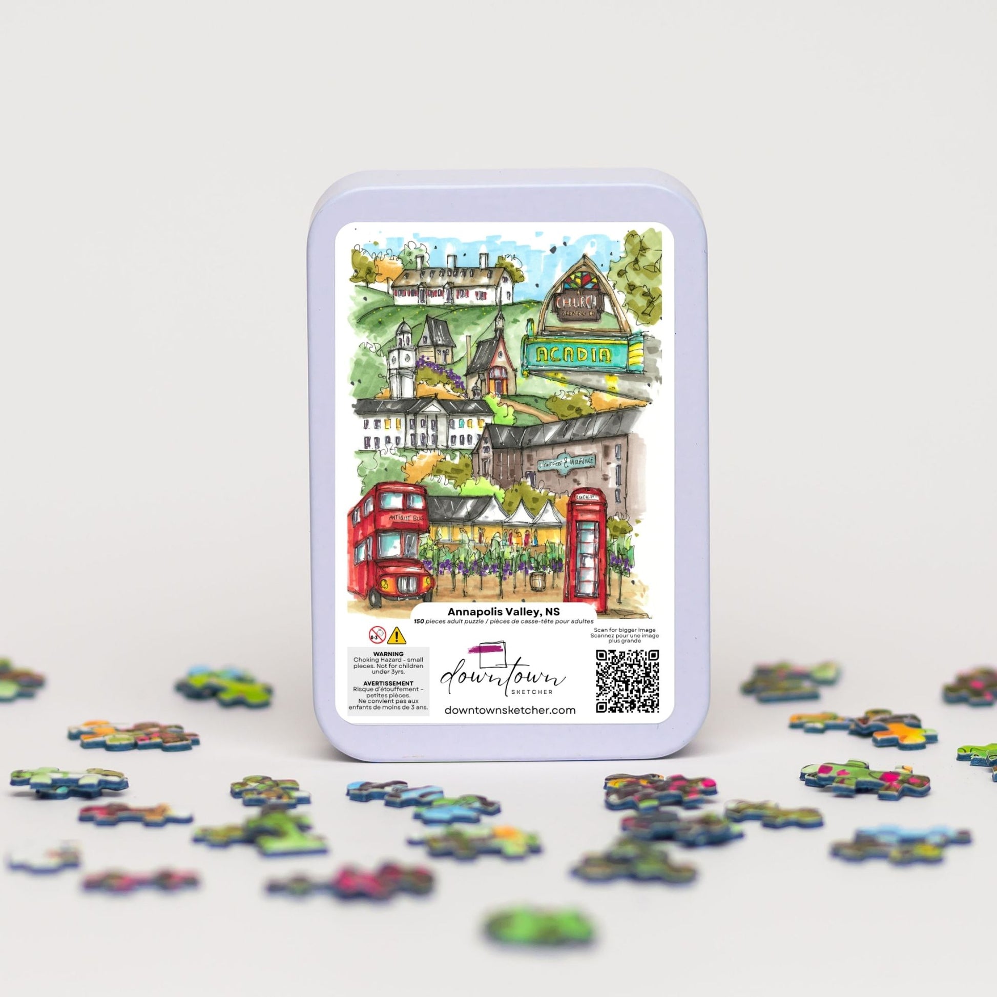 The Annapolis Valley Mini Luxury Puzzle beautifully showcases the rich agricultural and historical heritage of this iconic Nova Scotia region. Featured landmarks include Luckett Vineyards, famous for its unique red telephone booth from which visitors can make calls—a quirky symbol blending tradition with modern charm. The puzzle also highlights Lightfoot & Wolfville, a beloved local vineyard and dining spot, and Acadia University, a cornerstone institution known for its vibrant academic and cultural presence. Alongside these, you’ll find the Acadia Al Whittle Theatre Sign and the Church Brewing Company sign, representing the valley’s thriving arts and craft beer scene. Fort Anne in Annapolis Royal, Canada’s oldest National Historic Site, anchors the puzzle with its storied past, while the Acadian House in the Historic Gardens of Annapolis Royal pays tribute to the area’s Acadian heritage. Finally, the Grand-Pré National Historic Site, part of the UNESCO World Heritage Landscape of Grand Pré, commemorates the enduring legacy of the Acadian people.