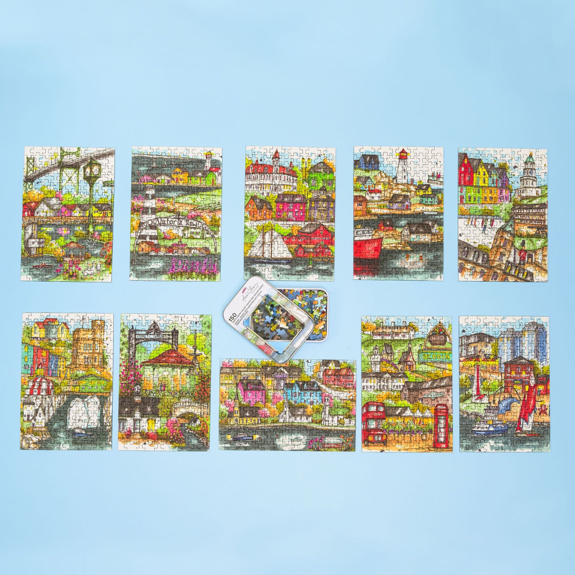 Crafted with luxurious blue core material and a refined linen finish, every puzzle piece offers a satisfying, tactile experience. Presented in a sleek tin travel case with a window, this mini puzzle is perfect for display, gifting, or as a portable keepsake for locals and visitors alike. Whether you’re a puzzle enthusiast or a lover of Halifax’s unique history, this mini puzzle invites you to relive the city’s most cherished landmarks, piece by piece.