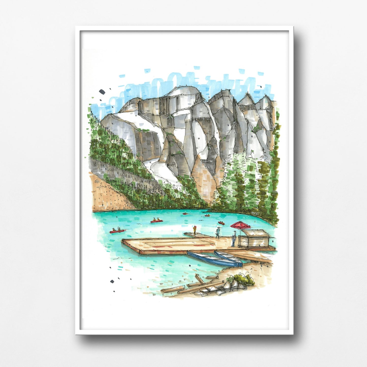 This sketch focuses on the Canoe Dock at Moraine Lake. It also emphasizes the vibrant colours of the canoes lined up, ready for exploration, against the backdrop of the stunning lake and majestic mountains. Moraine Lake Lodge offers guests a cozy and immersive experience in one of Canada's most beautiful settings.