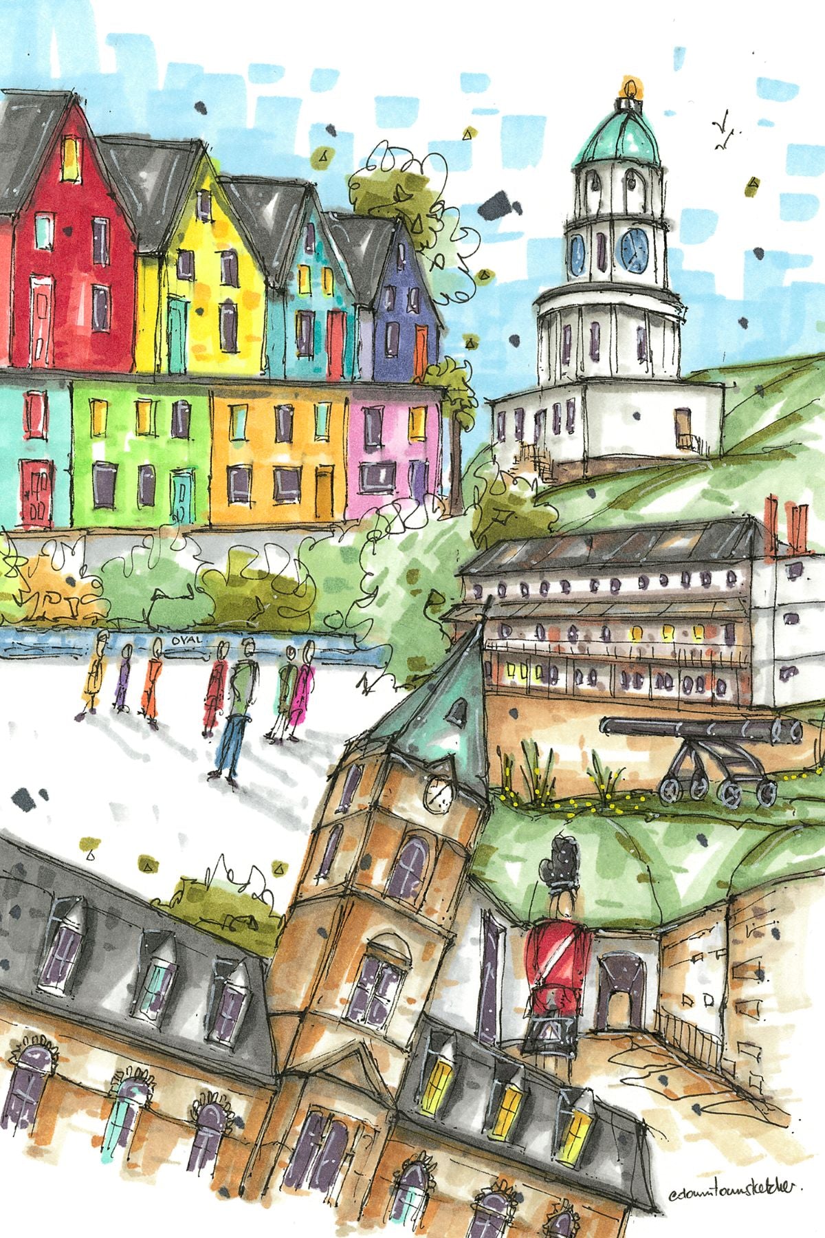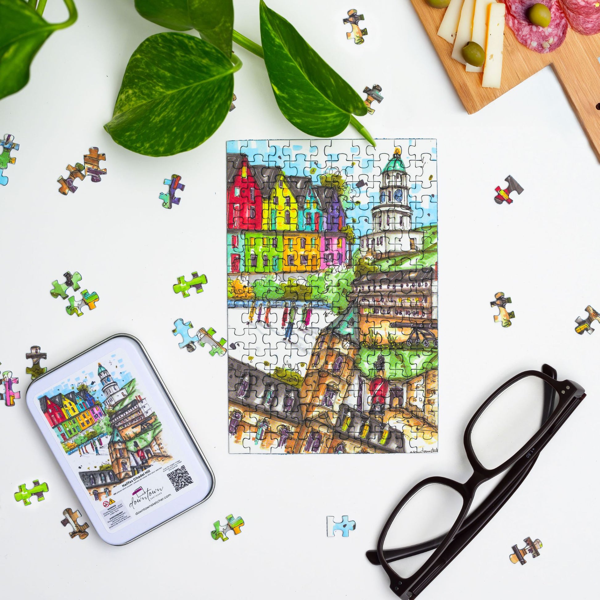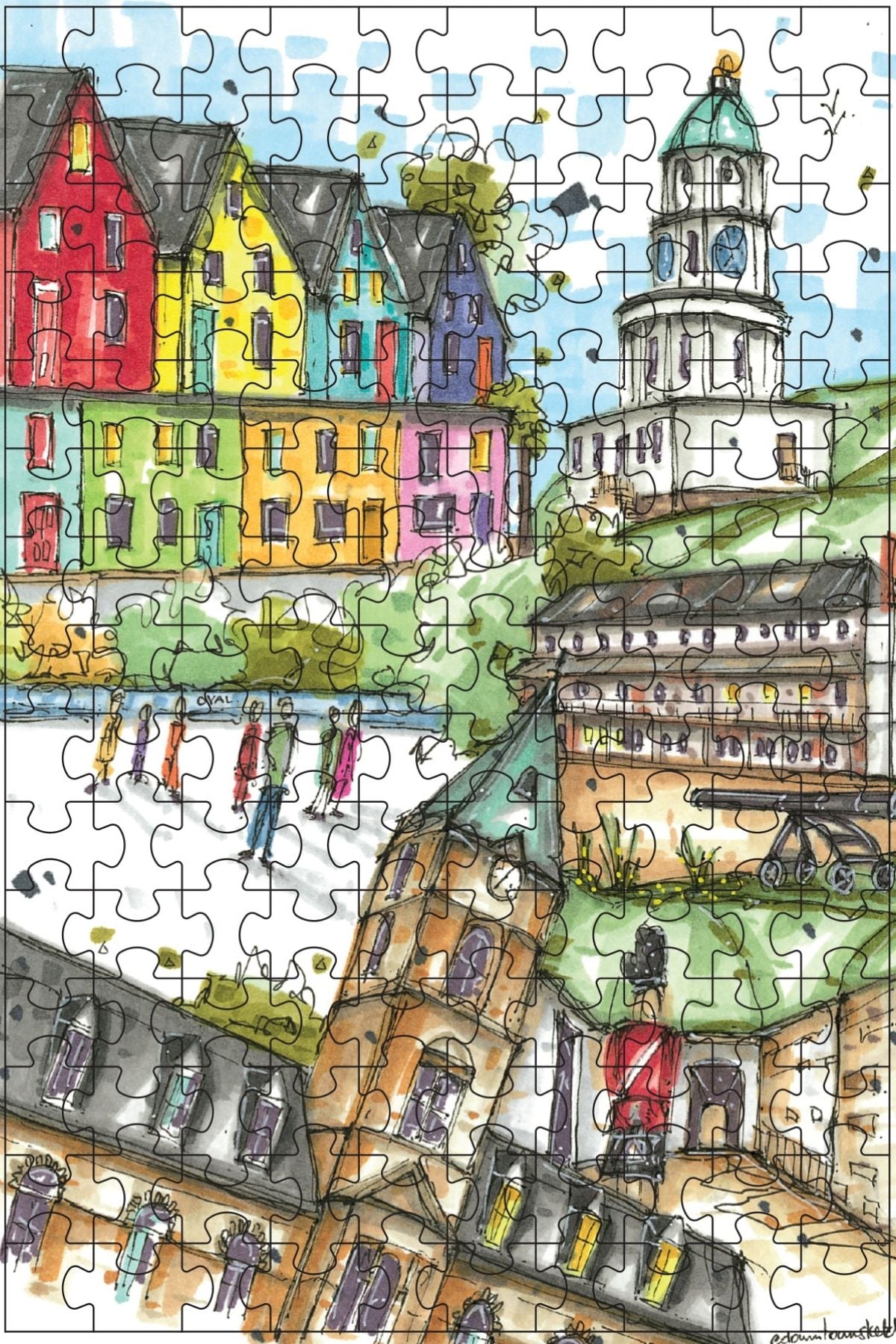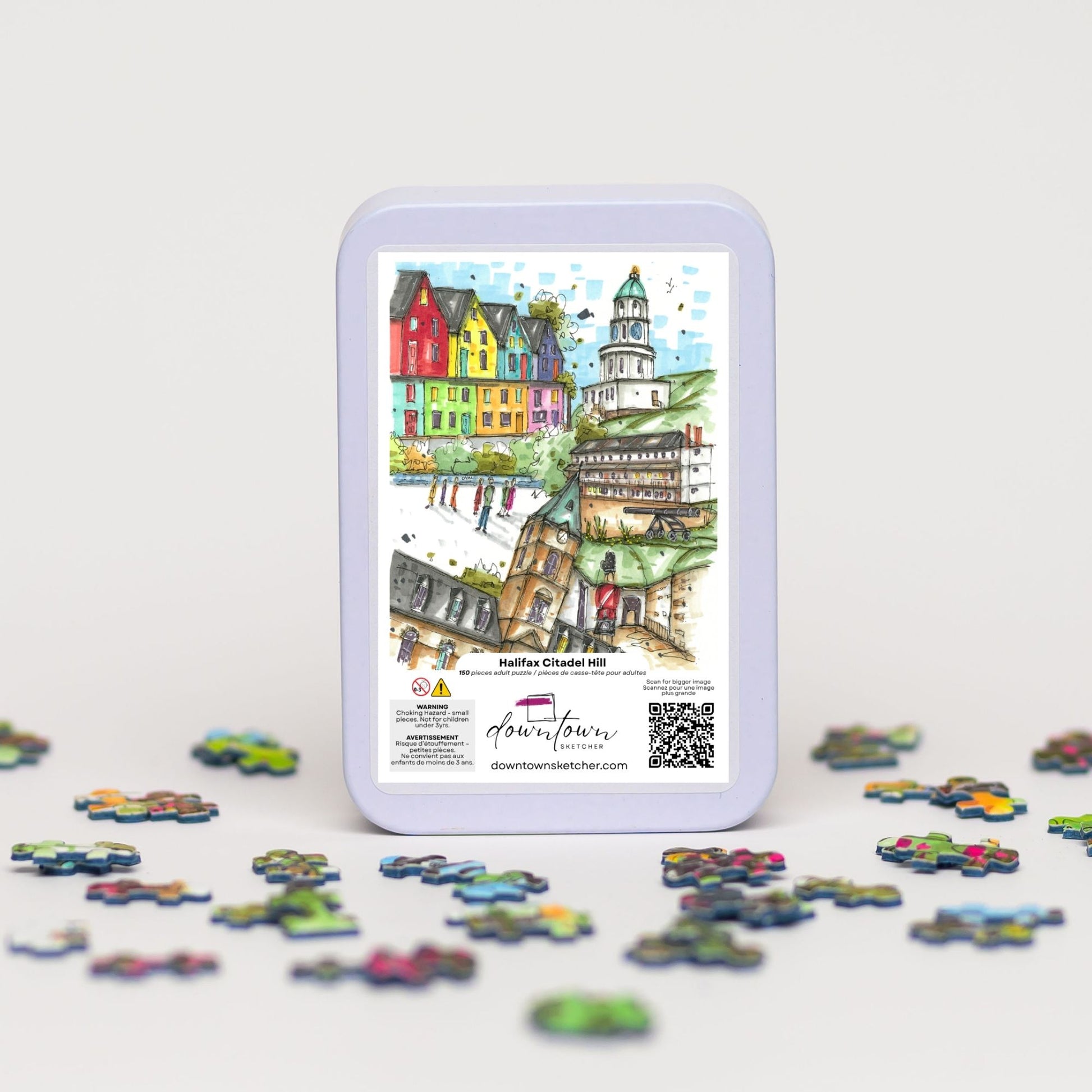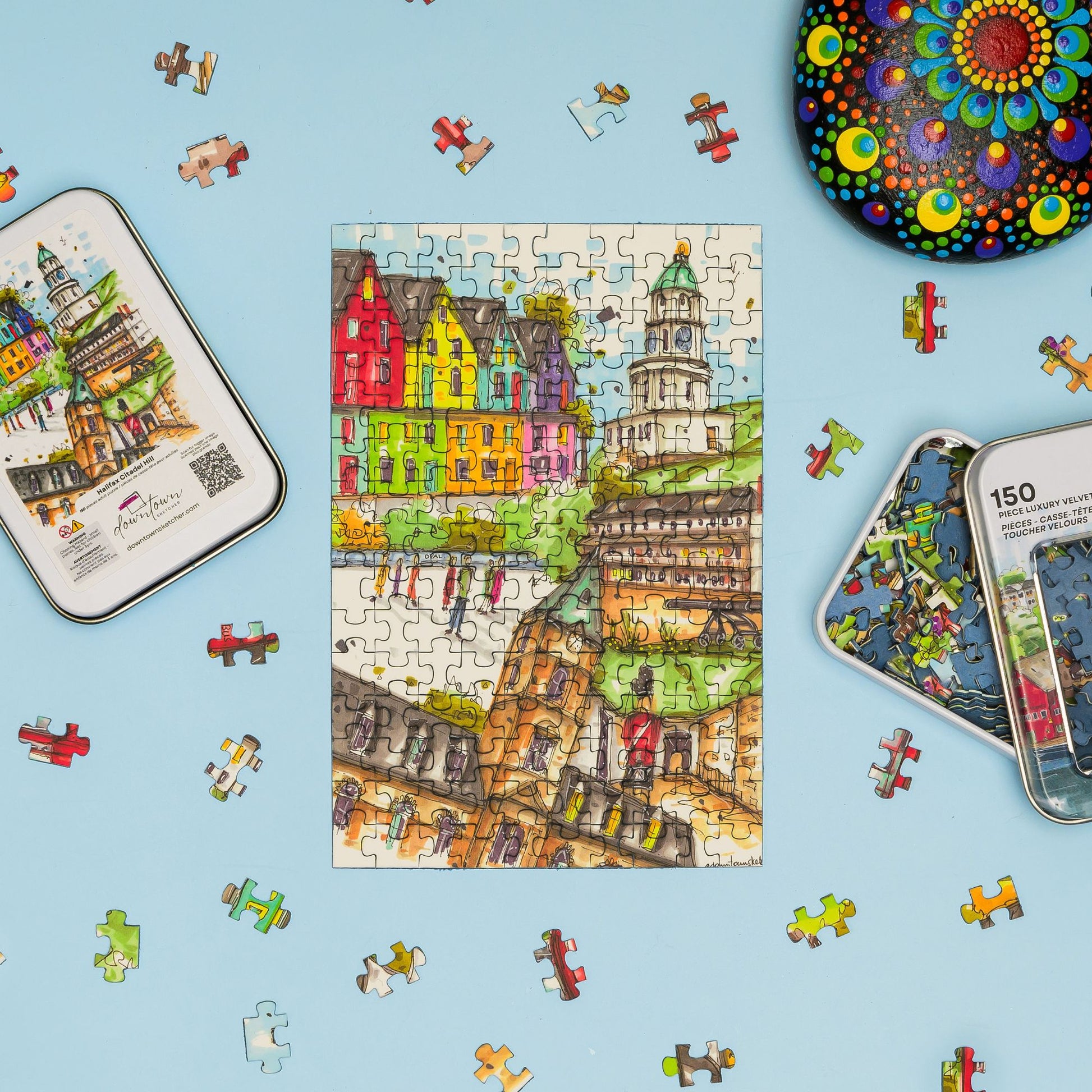 Discover Halifax’s vibrant heritage, one piece at a time, with Downtown Sketcher’s Halifax Landmarks Mini Puzzle. This illustrated 4x6" puzzle (150 pieces) brings together a collection of the city’s most iconic sights. At the heart of the puzzle stands the Citadel Clock Tower, its familiar silhouette rising above the grassy slopes of Citadel Hill, while a uniformed guard stands watch in front of the historic fort, evoking Halifax’s proud military tradition. In the top corner, you’ll spot the distinctive colourful houses from Queen Street—a beloved local landmark now lost to time. Just above those the famous Four Sisters houses of the North End, their cheerful facades a testament to the city’s architectural charm.