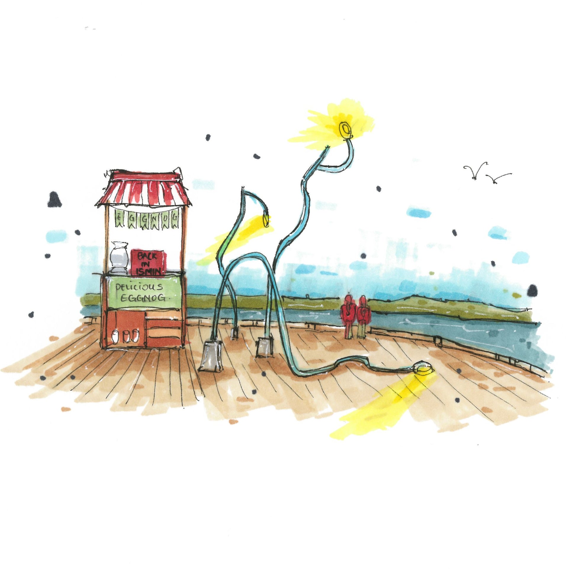This sketch captures a charming holiday scene on the Halifax boardwalk, featuring an eggnog stand next to the iconic Drunken Lamppost art installation. One never knows what could happen with an unmanned eggnog stand.