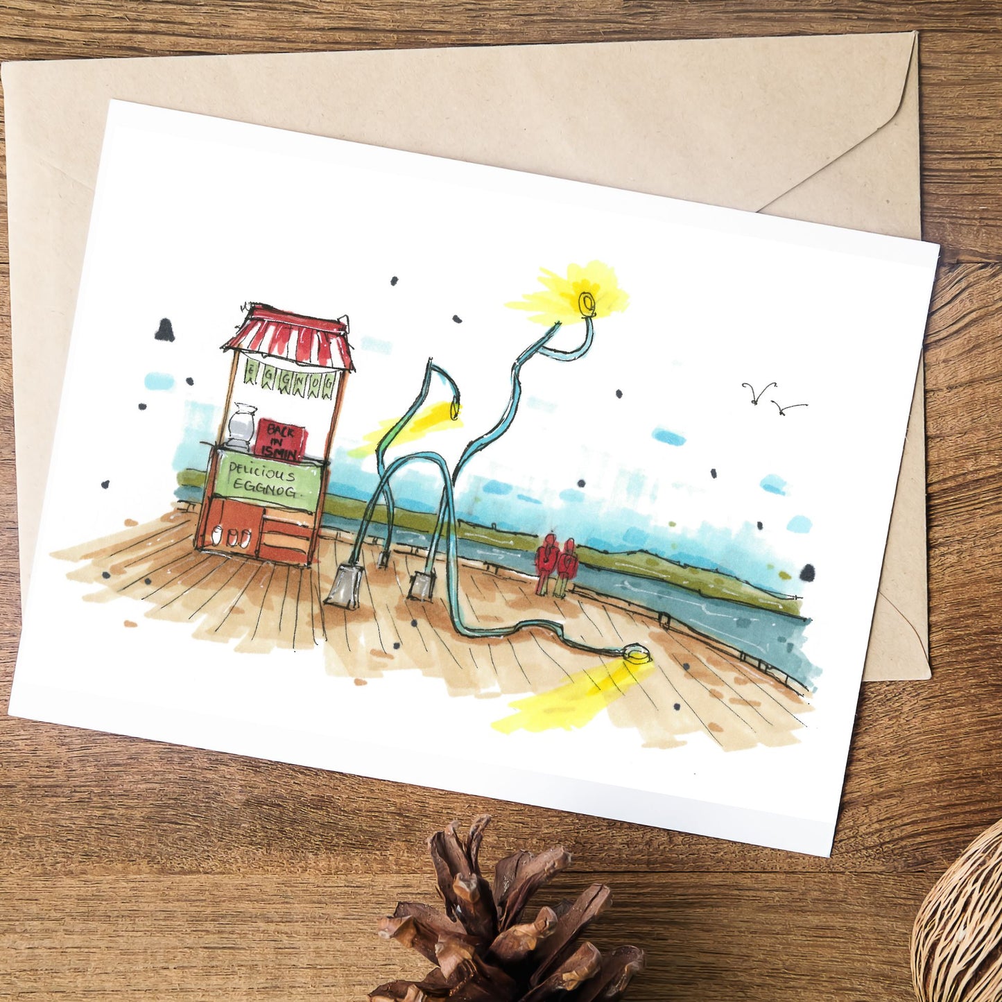 In the sketch, the juxtaposition of the quirky Drunken Lamppost with a festive eggnog stand creates a uniquely Halifax holiday scene. By combining a well-known Halifax art installation with seasonal elements, the sketch offers a distinctive and locally relevant holiday greeting that would appeal to both residents and visitors familiar with the Halifax waterfront.