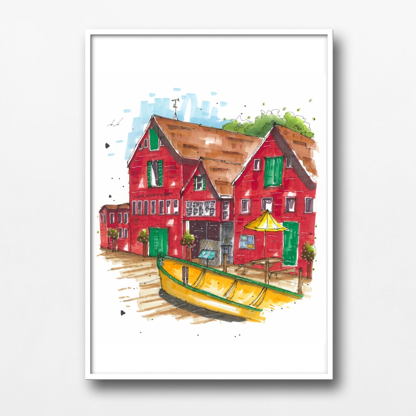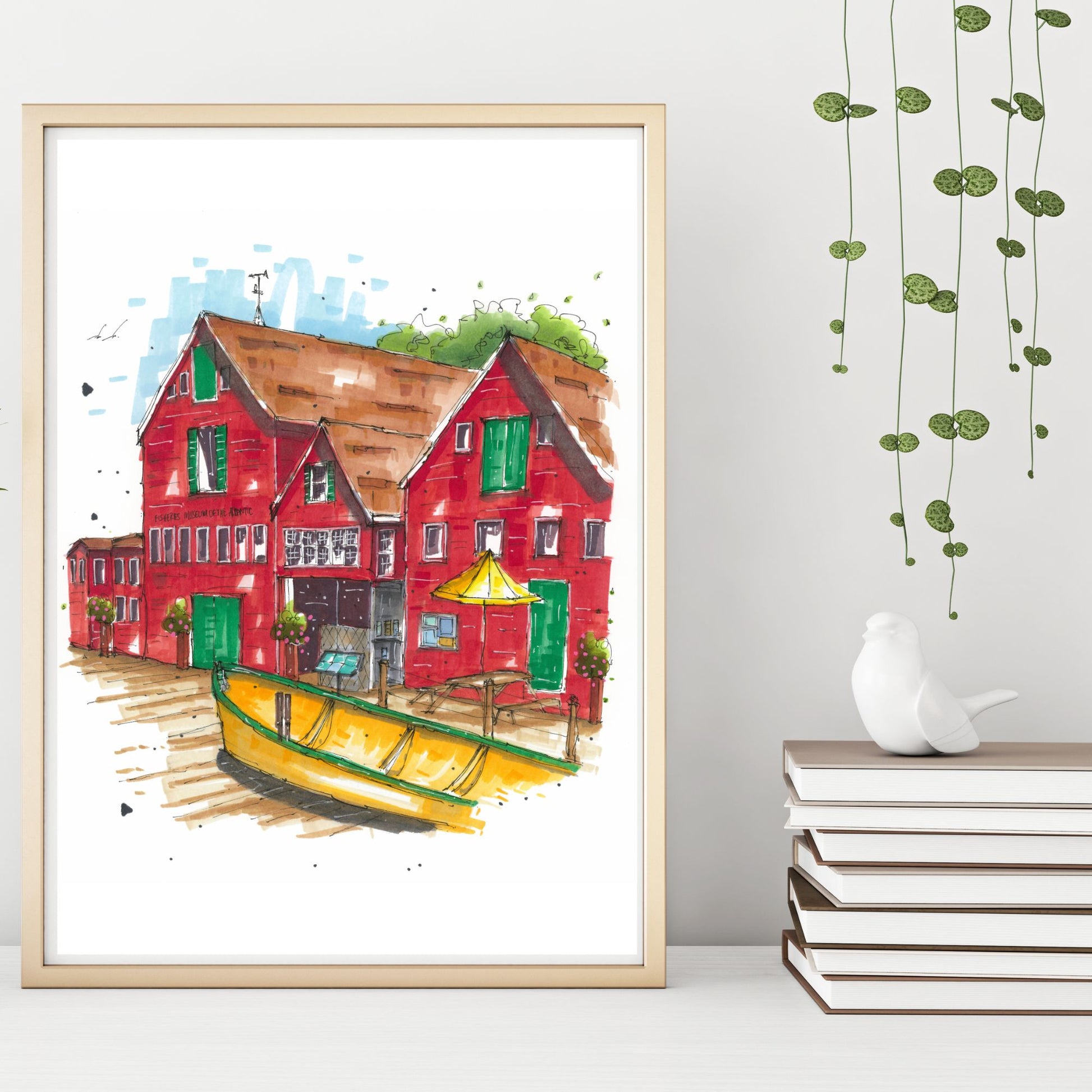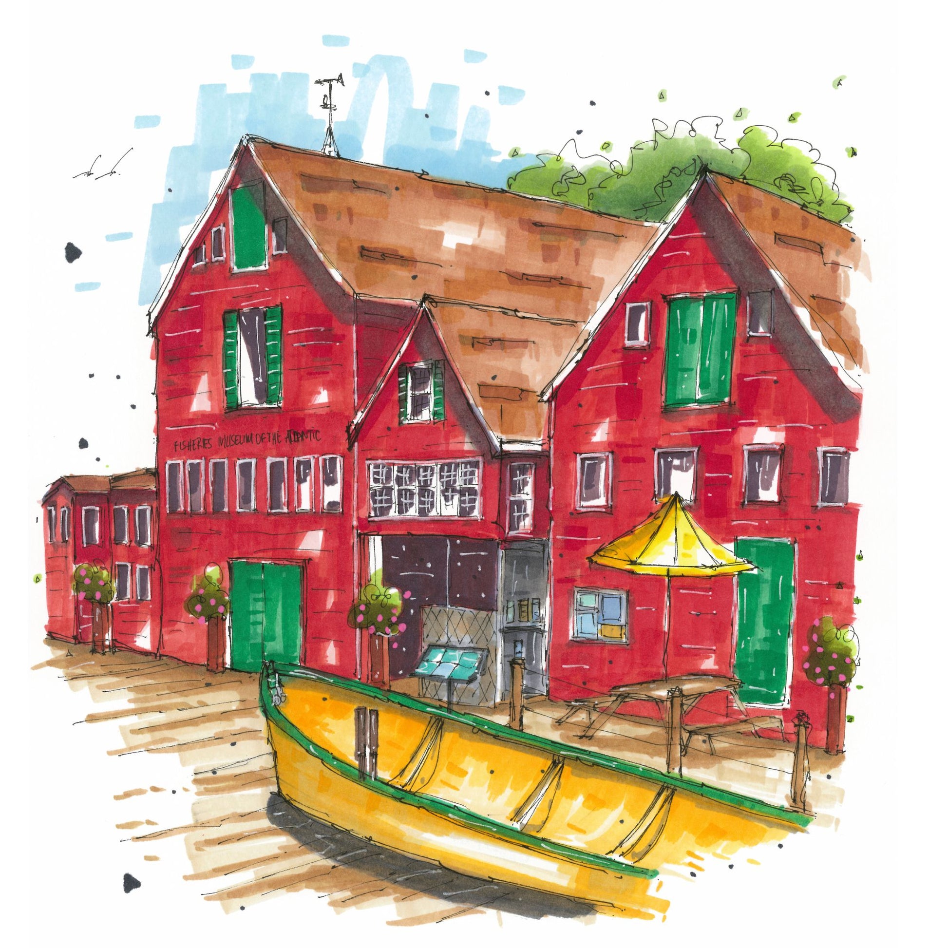 In this sketch I've captured the iconic Fisheries Museum of the Atlantic in Lunenburg, Nova Scotia. The museum's distinctive red buildings stand out prominently against the backdrop of the historic waterfront, embodying the rich maritime heritage of this UNESCO World Heritage Site.