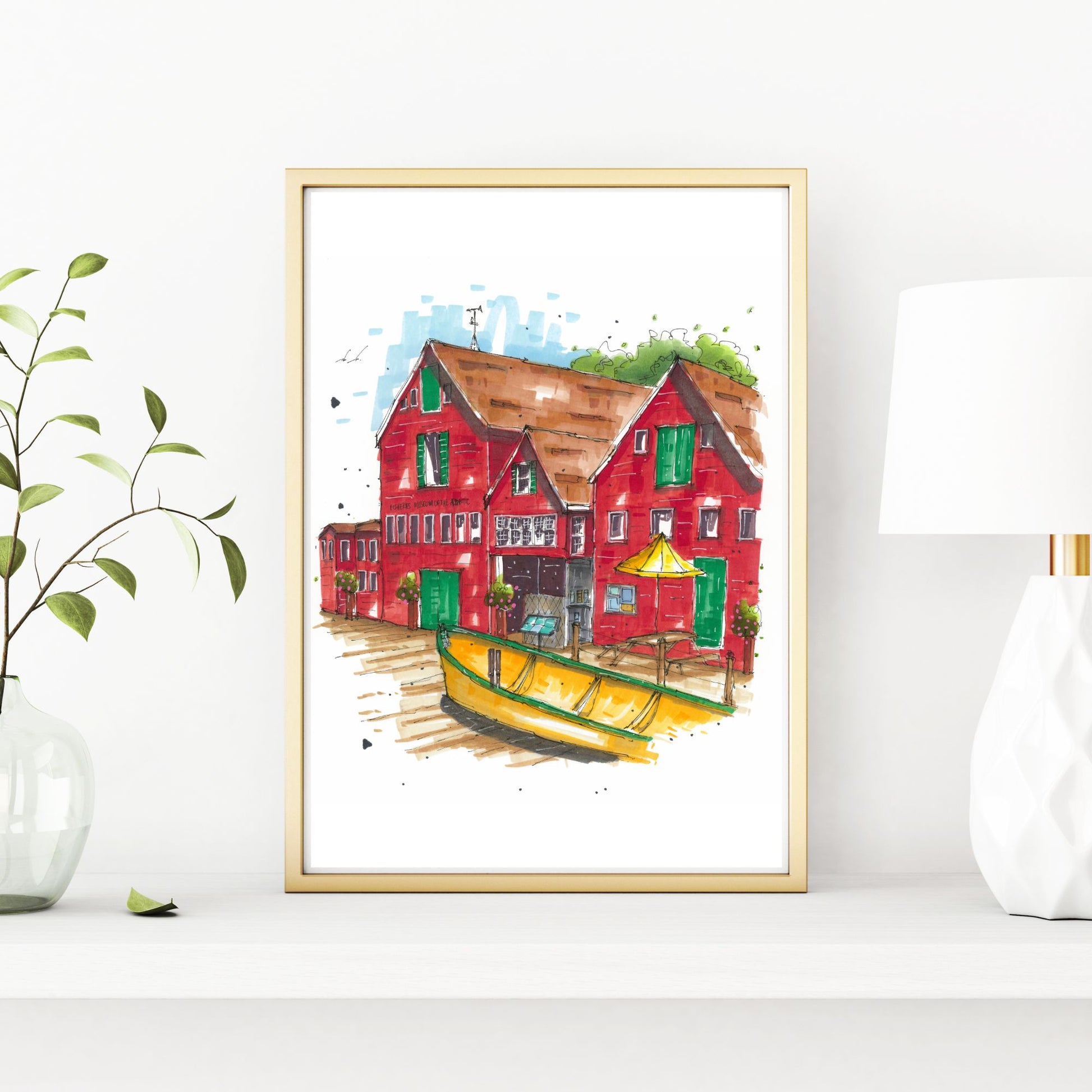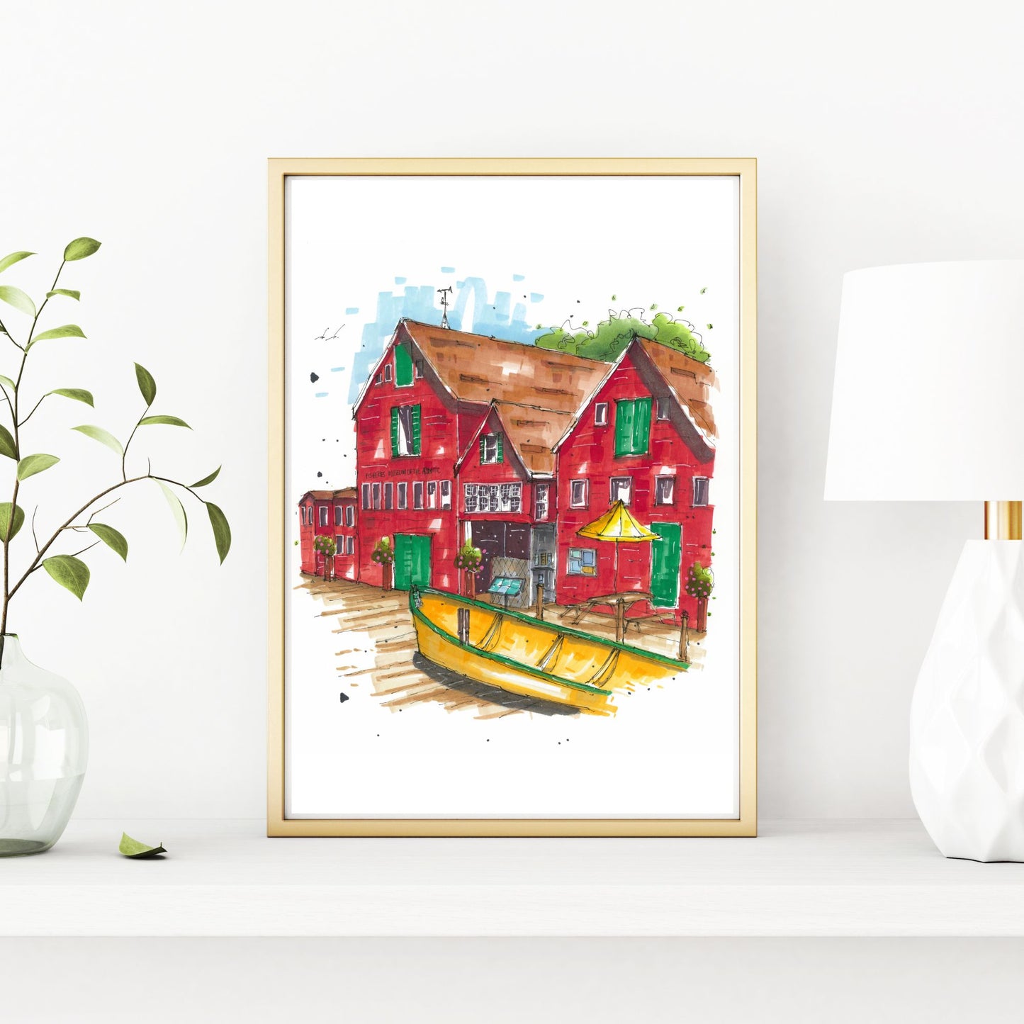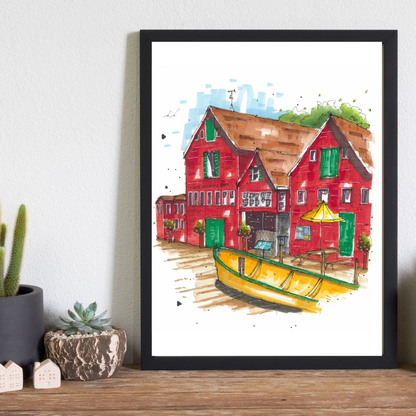 In this sketch I've captured the iconic Fisheries Museum of the Atlantic in Lunenburg, Nova Scotia. The museum's distinctive red buildings stand out prominently against the backdrop of the historic waterfront, embodying the rich maritime heritage of this UNESCO World Heritage Site.