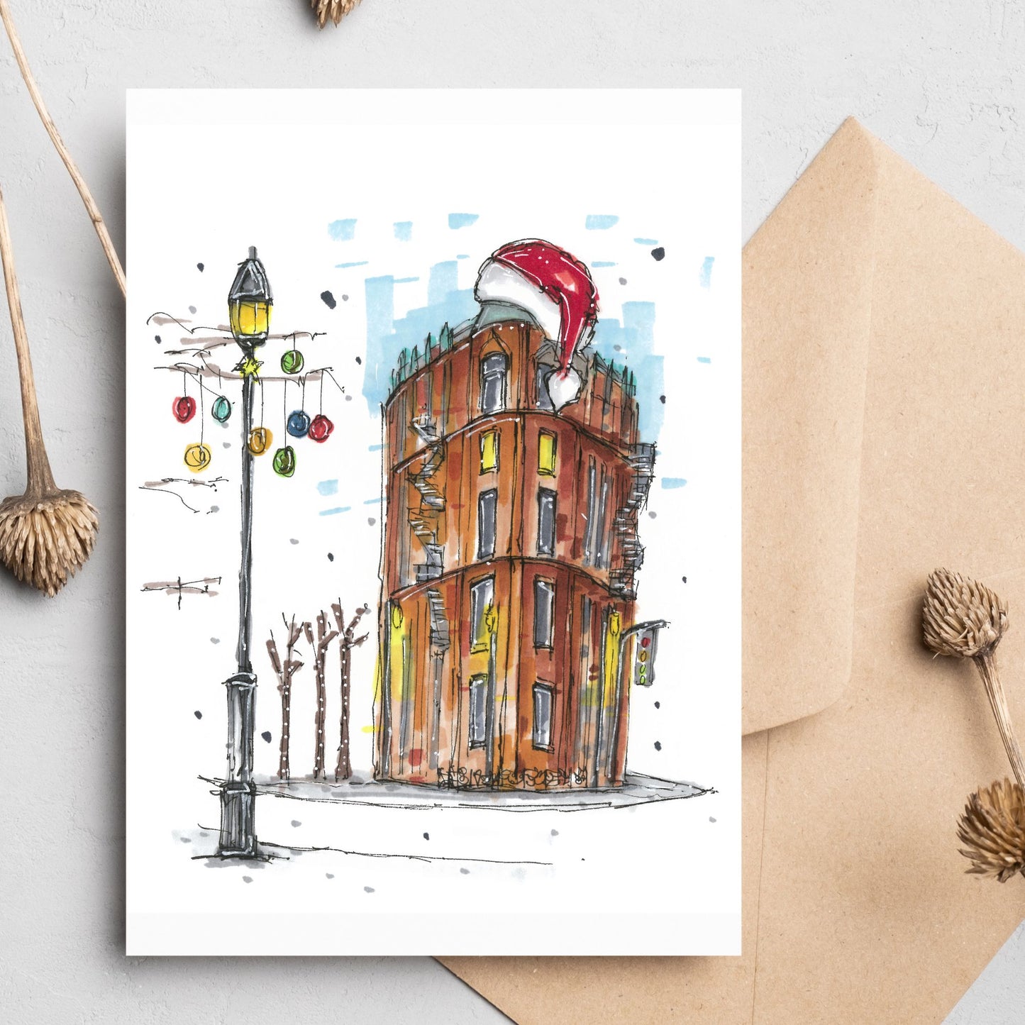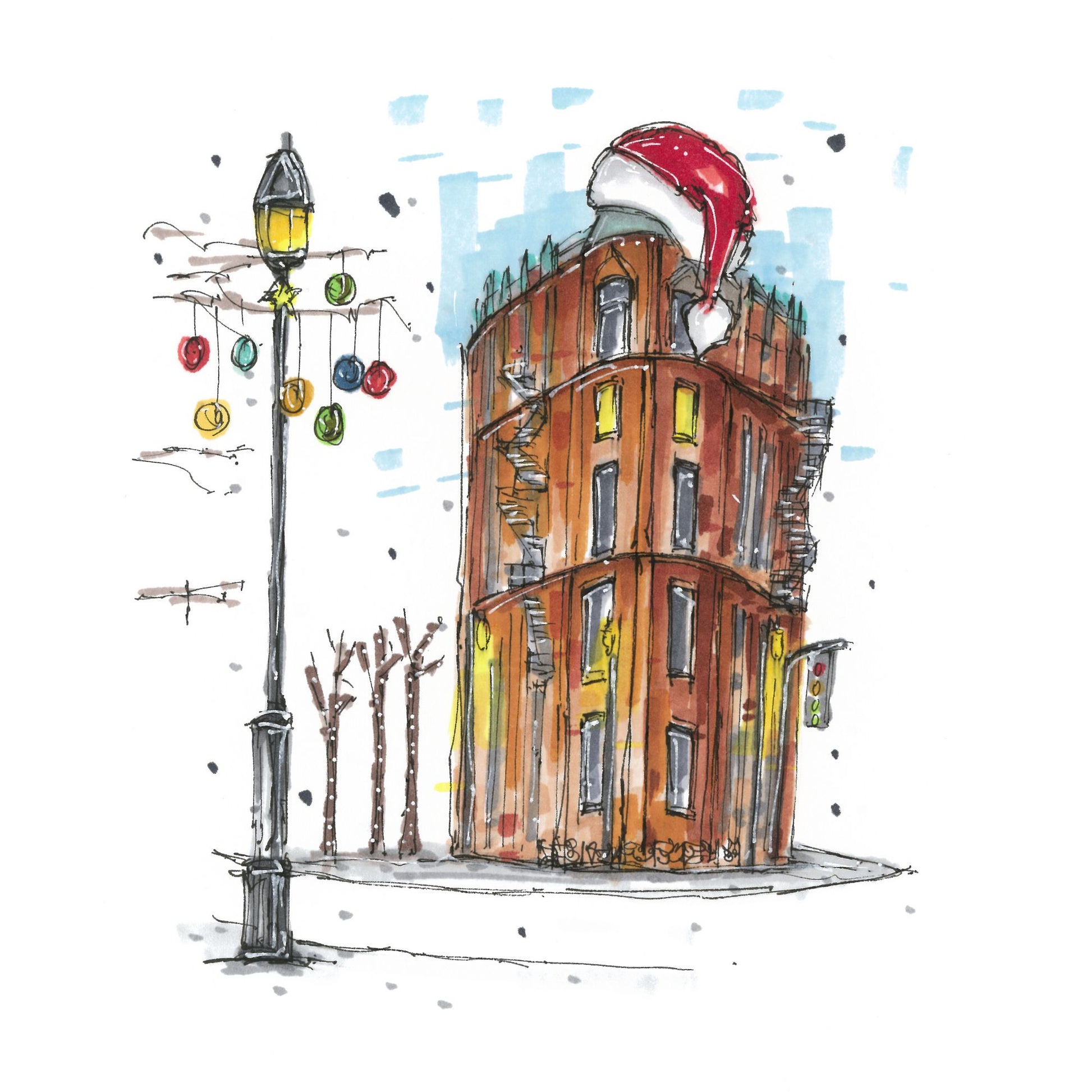 In this delightful sketch, the iconic Gooderham Building—often referred to as the Flatiron Building—wears a festive Christmas hat, transforming it into a charming holiday card. This whimsical depiction captures the building's unique triangular shape and historical significance while adding a playful touch that embodies the spirit of the season.