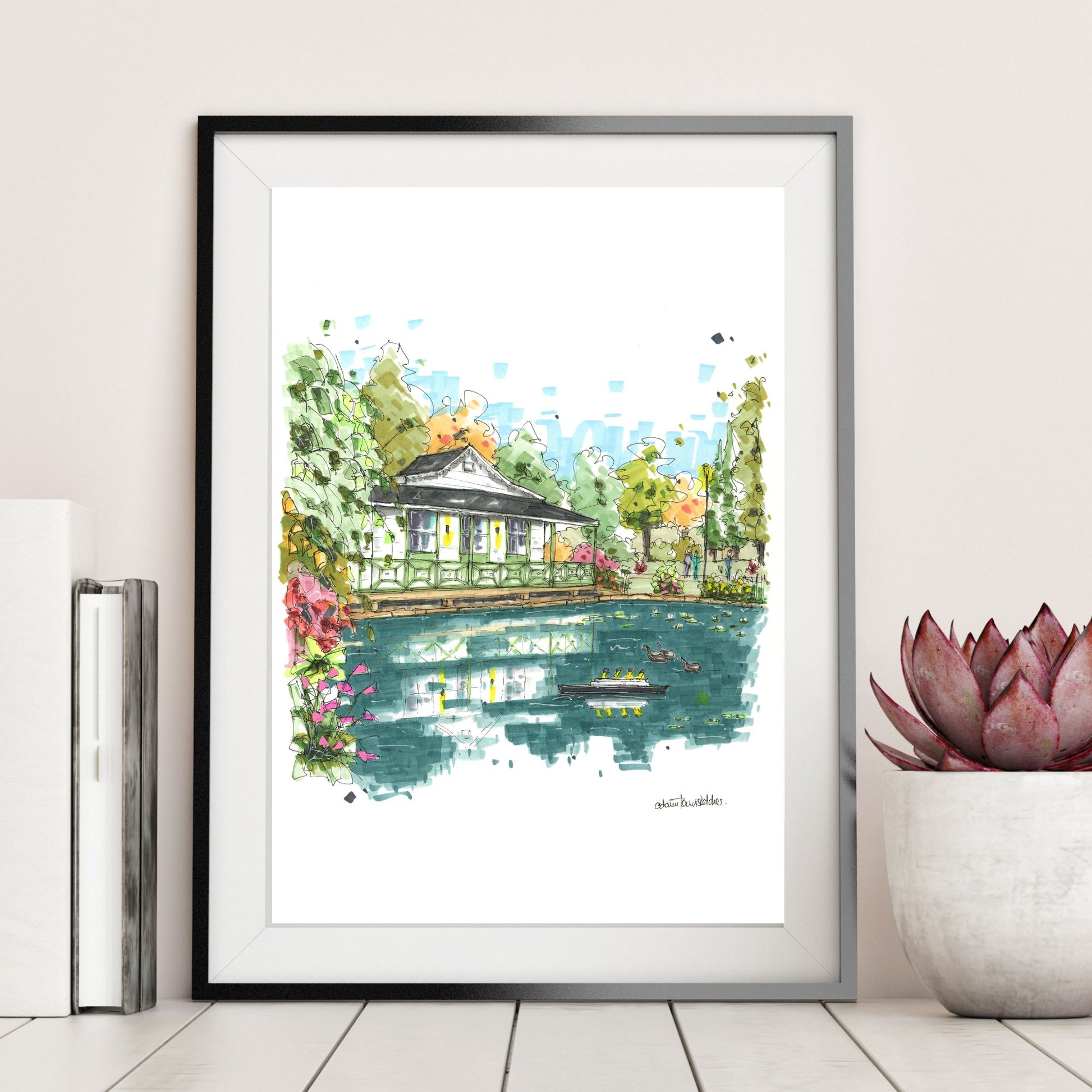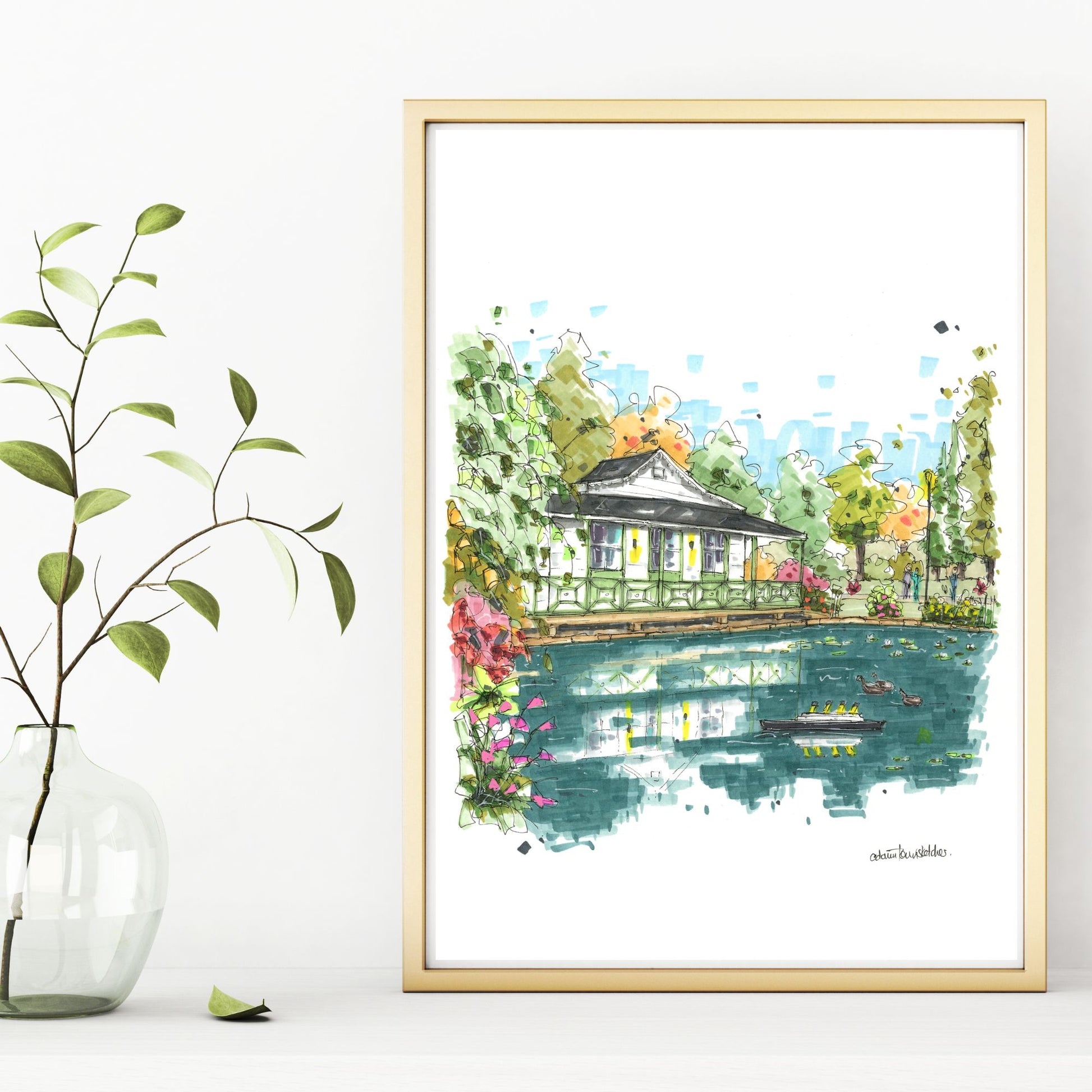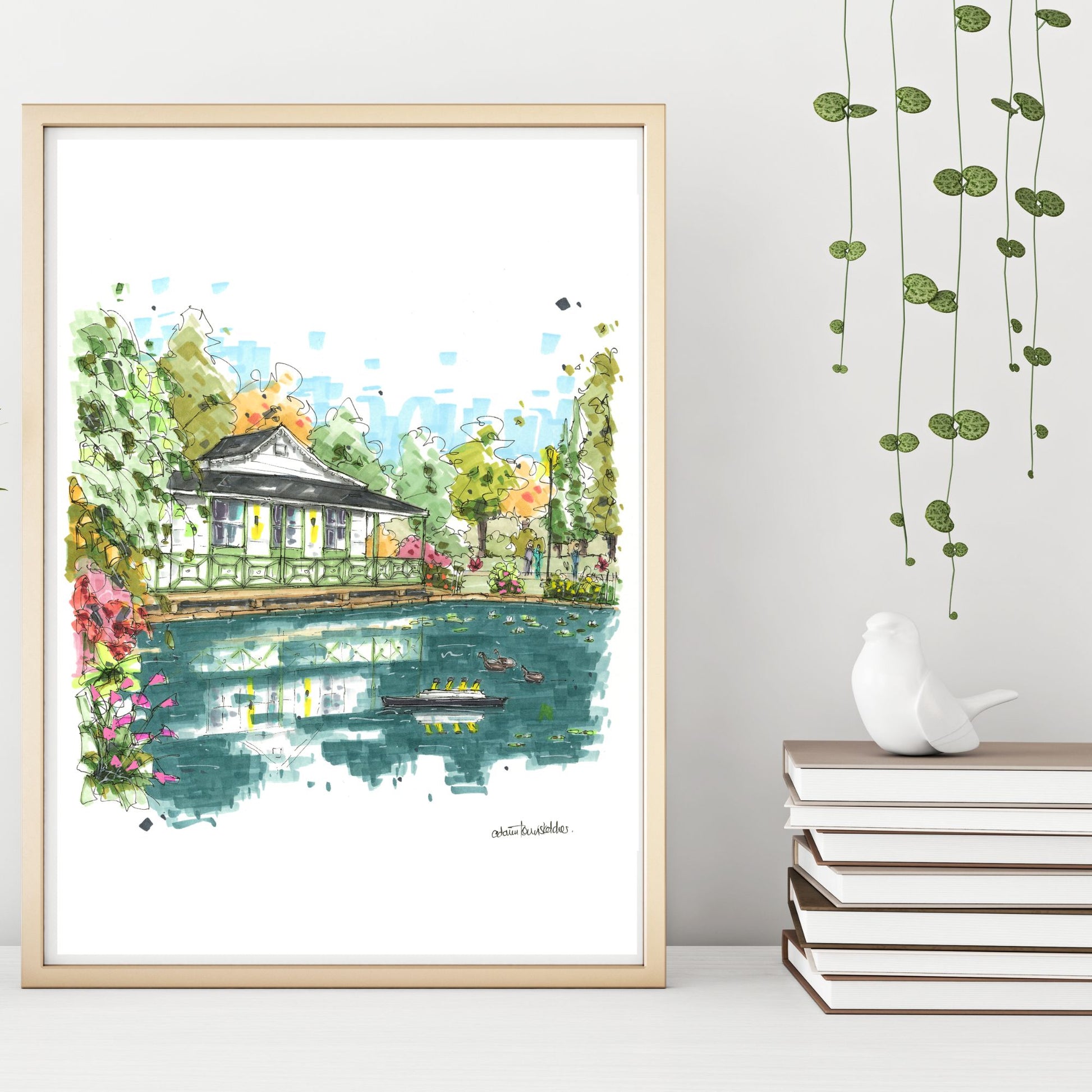 This sketch captures one of the Halifax Public Gardens’ most recognizable vistas: serene Griffin’s Pond, adorned each summer by the striking model of the RMS Titanic, and framed by the heritage pump house nestled quietly behind. The piece brings together elements of local legend, remembrance, and architectural charm, for a truly memorable view.