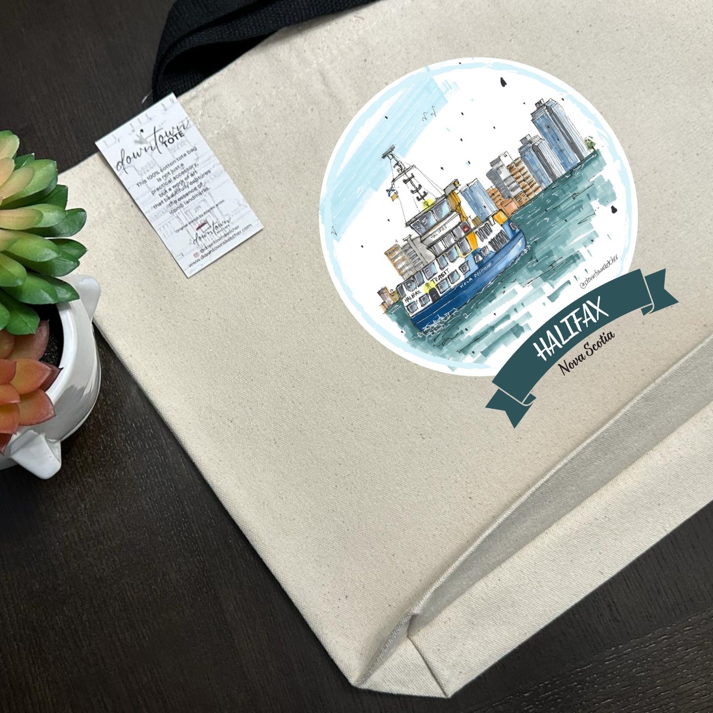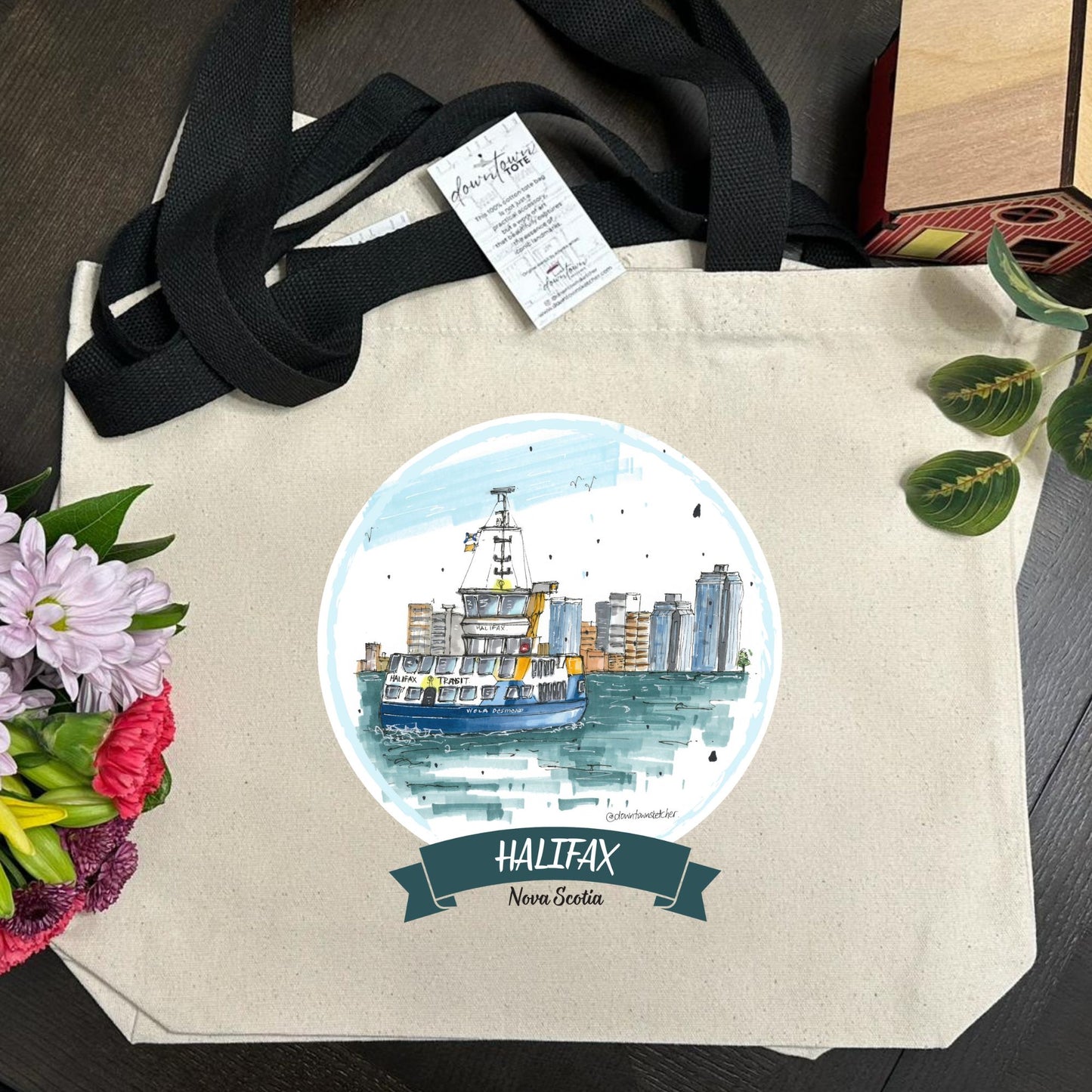 A tote bag featuring an artwork sketch of The Halifax Ferry by Downtown Sketcher which captures the iconic Halifax Ferry, an integral part of Halifax's transportation system for many years. The ferry service in Halifax dates back to the early 18th century, making it one of the oldest saltwater ferry services in North America. The ferry connects downtown Halifax with Dartmouth, offering a picturesque and convenient mode of transportation across the harbor.
