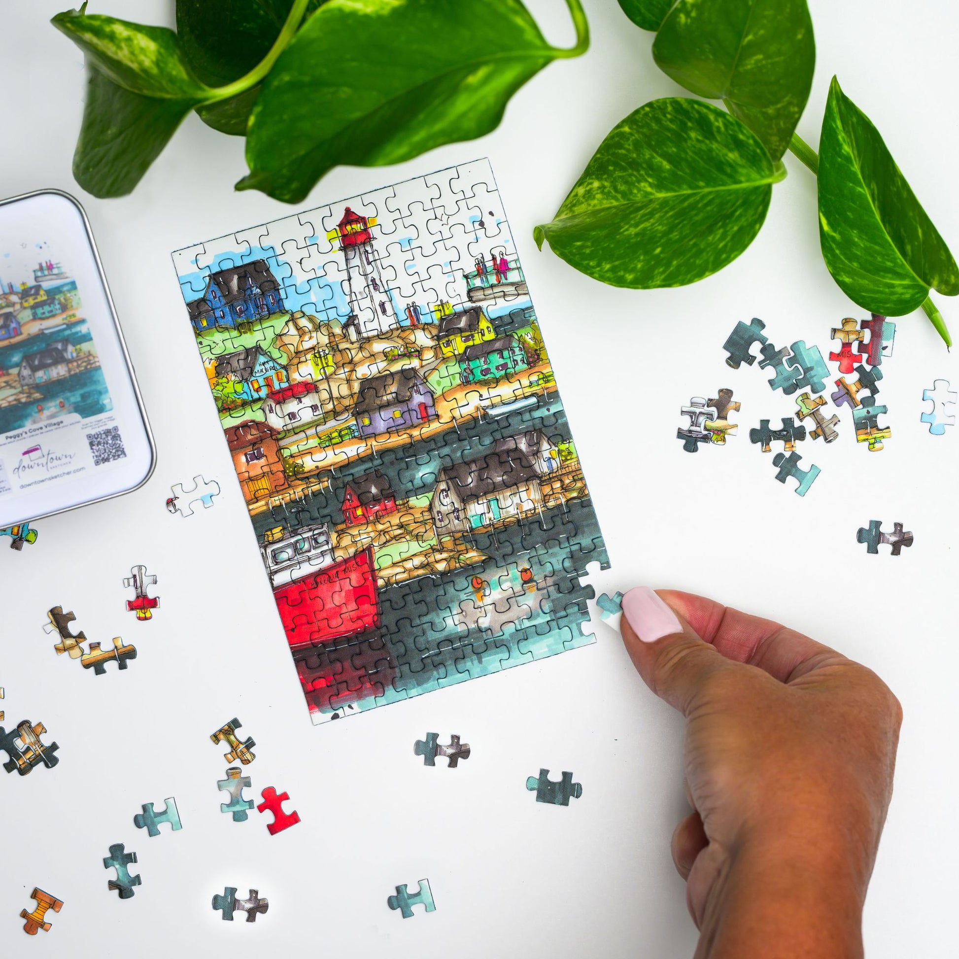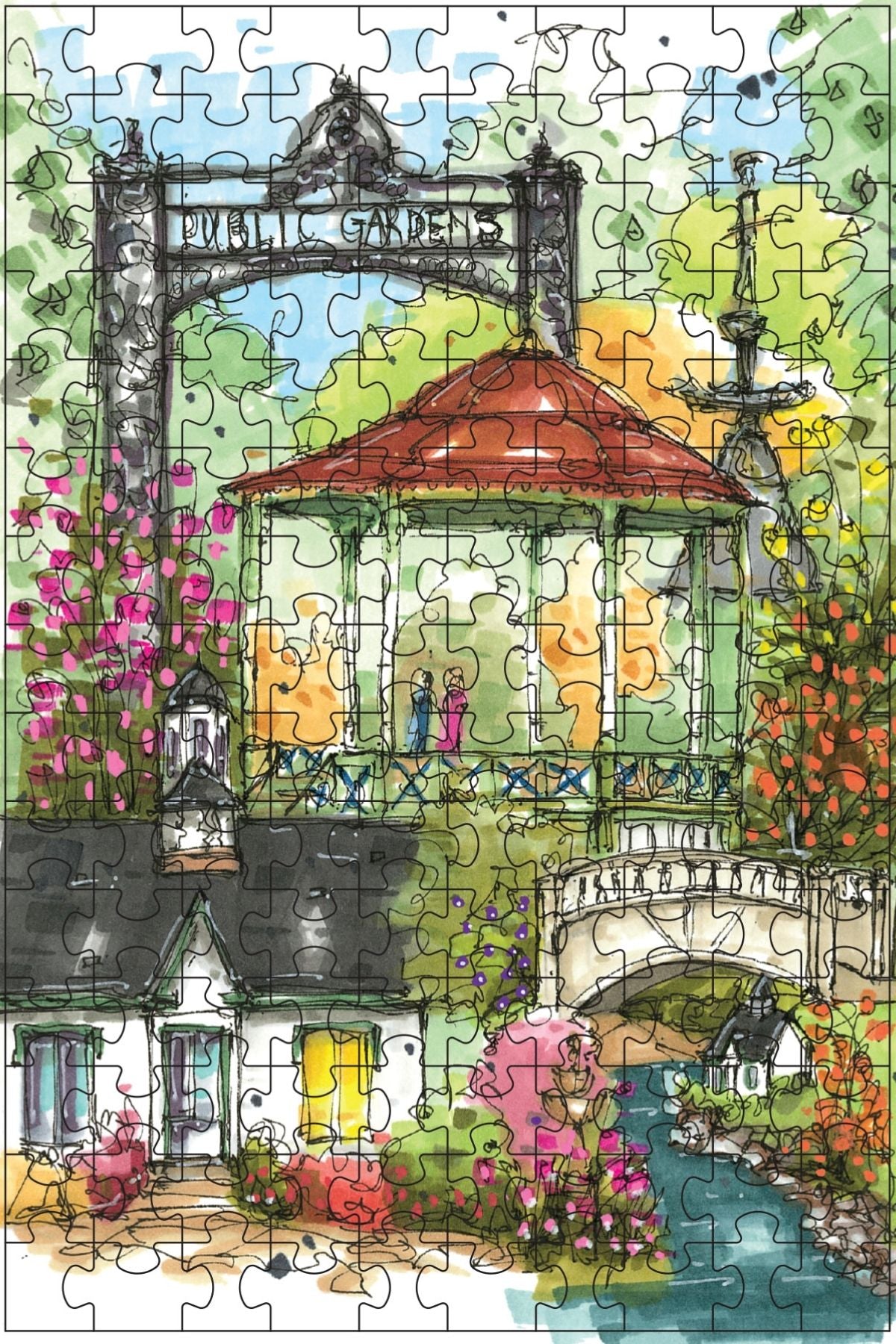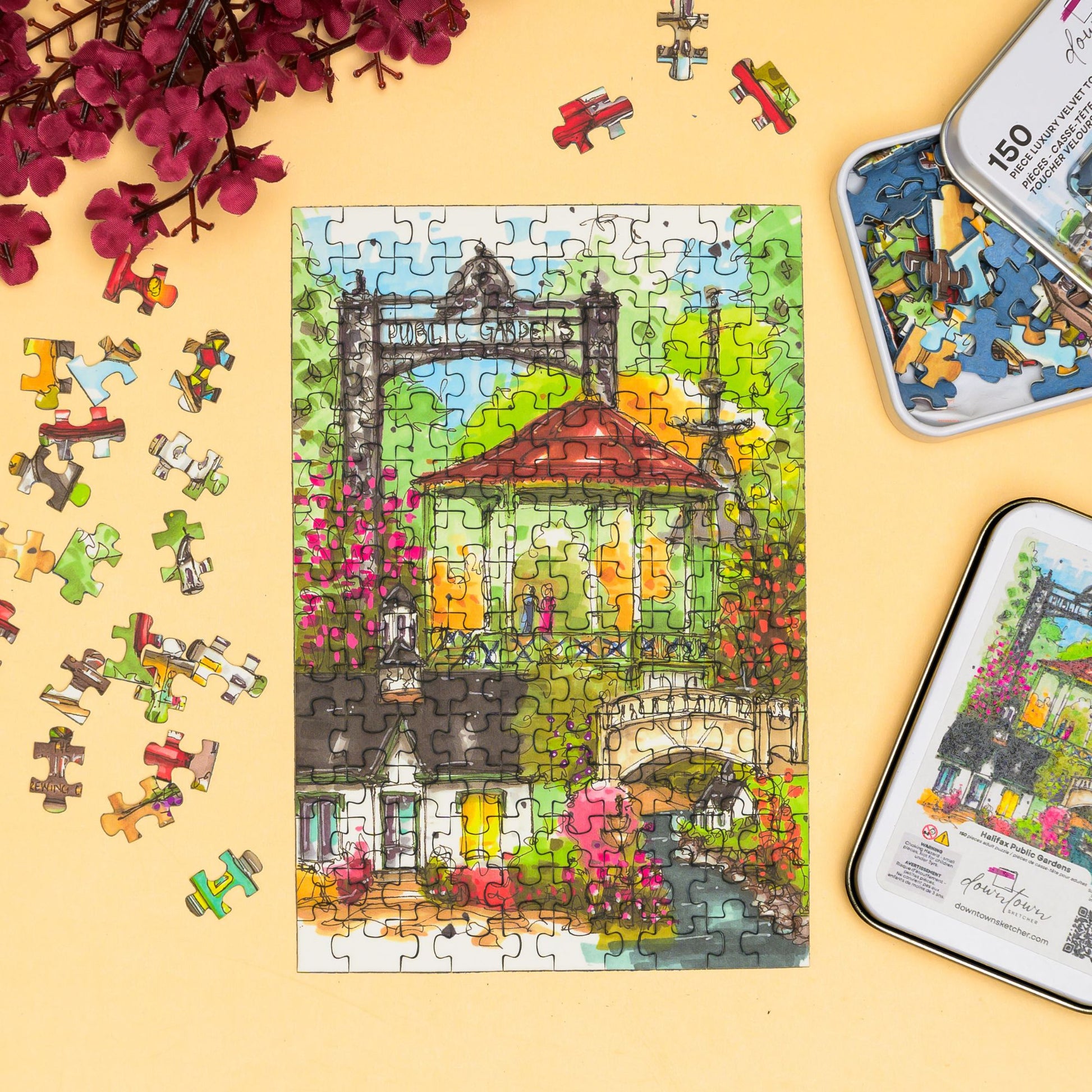 Experience the charm of one of Halifax’s most beloved landmarks with Downtown Sketcher’s Halifax Public Gardens Mini Puzzle. This beautifully detailed 4x6" puzzle (150 pieces) captures the essence of the gardens, featuring the iconic wrought-iron gates, the elegant gazebo, the inviting coffee shop, the picturesque bridge, and the tranquil Griffins Pond. Look closely and you’ll even spot the famous model Titanic floating among a riot of vibrant flowers, all illustrated in Downtown Sketcher’s signature style.