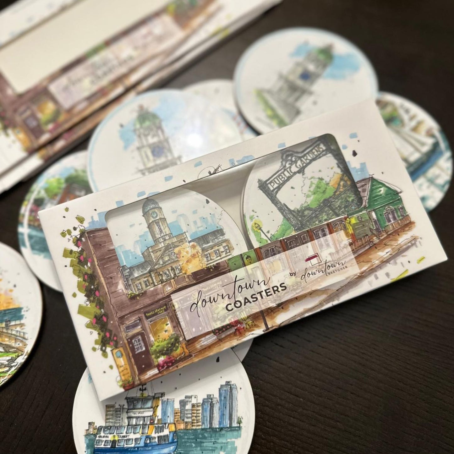 These delightful coasters feature hand-drawn sketches lovingly capturing the essence of local landmarks, storefronts, and iconic eateries. With their practical cork backing, they make the perfect gift for loved ones or a delightful addition to your own home or office - bringing the region's beauty and maritime spirit to your daily routine.