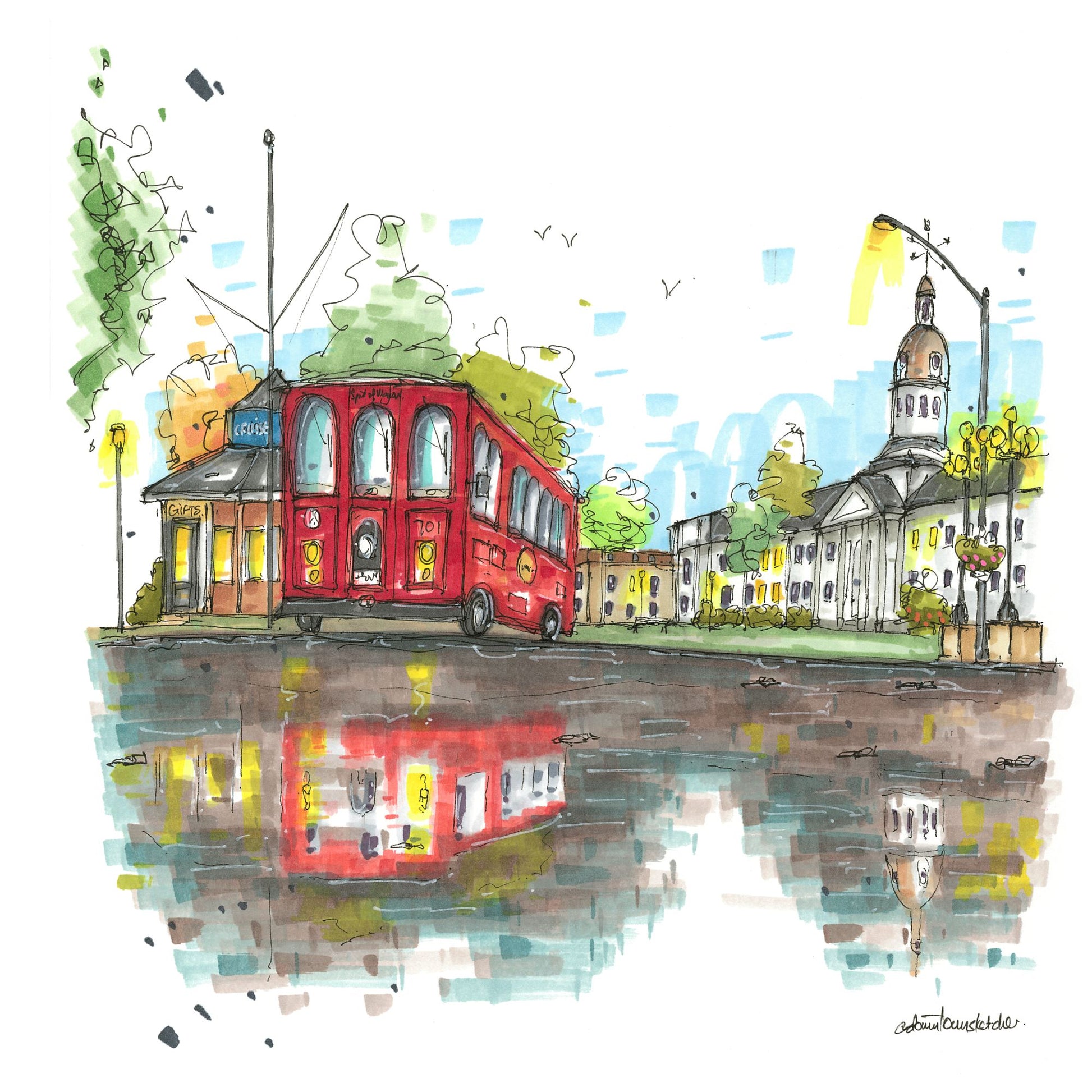 The lively and charming Hop-On Hop-Off Kingston Trolley Tour is a delightful way to explore the historic city of Kingston, Ontario and this sketch captures its nostalgic appeal. The trolley itself, with its classic design and bright red colour, invites visitors to embark on a flexible and informative journey through one of Canada’s most picturesque and historically rich cities and is available as a greeting card.