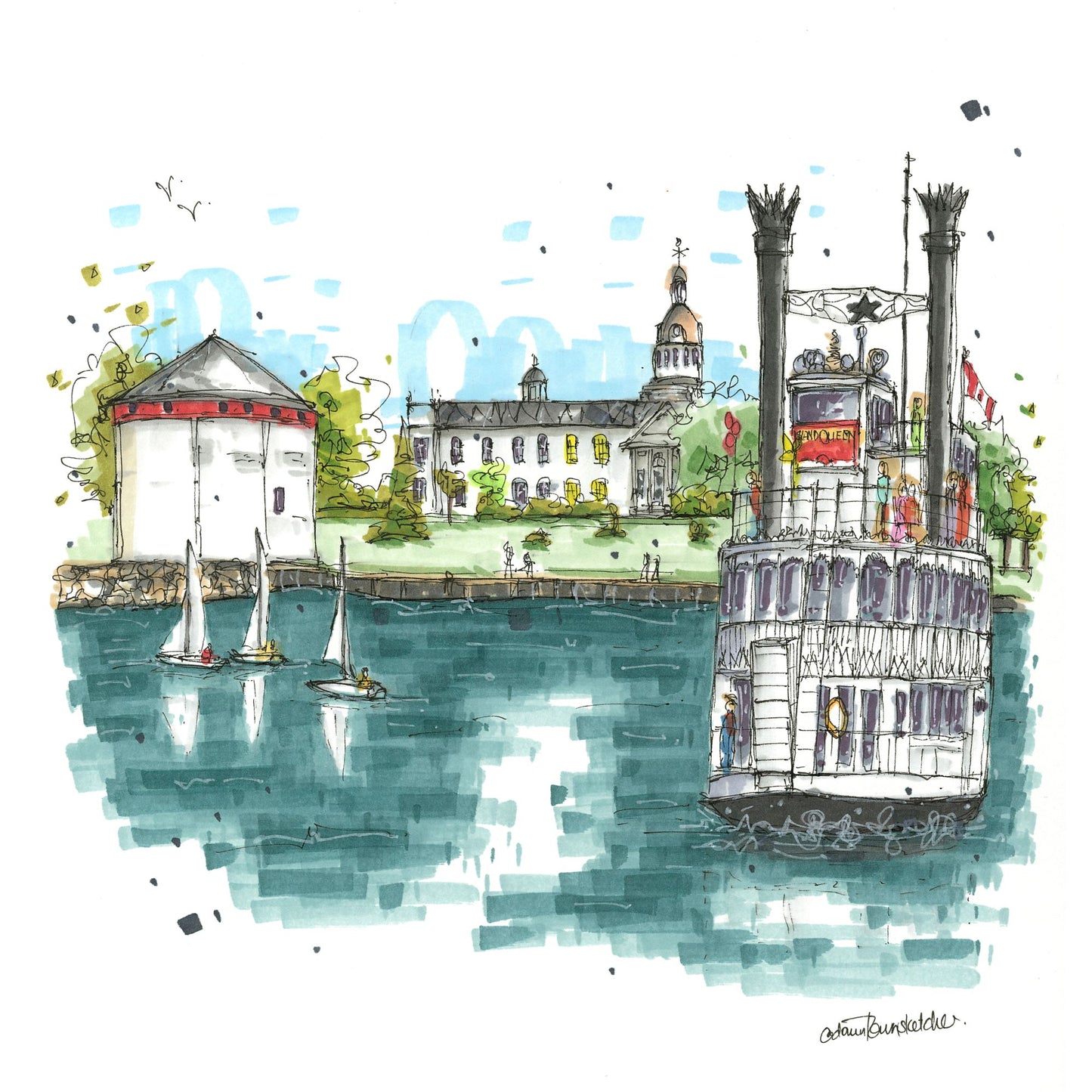 This sketch, available as a greeting card, captures the bustling waterfront of Kingston, Ontario, where the majestic Island Queen sets sail against the historic backdrop of Shoal Tower. This scene encapsulates the city’s blend of natural beauty and rich heritage, inviting viewers to experience the magic of the 1000 Islands from the water. The Island Queen is operated by Kingston Destination Group, a renowned company dedicated to showcasing the best of Kingston’s waterfront and the world-famous 1000 Islands region. With a legacy rooted in hospitality and local expertise, Kingston Destination Group has been connecting visitors with the scenic wonders and historic sites of the area for decades.