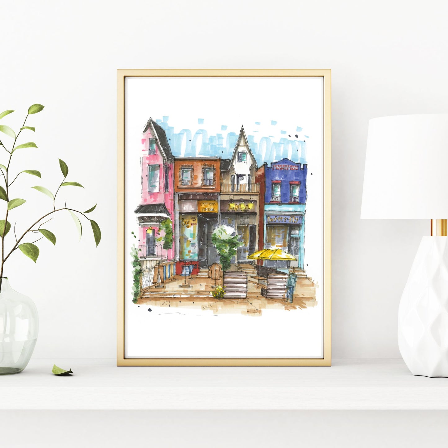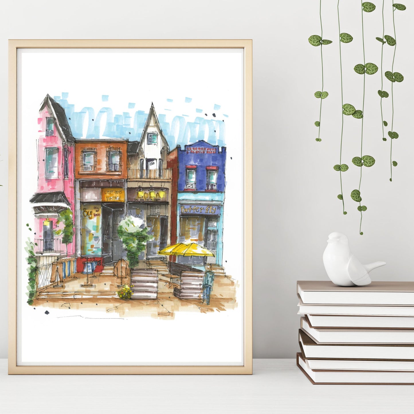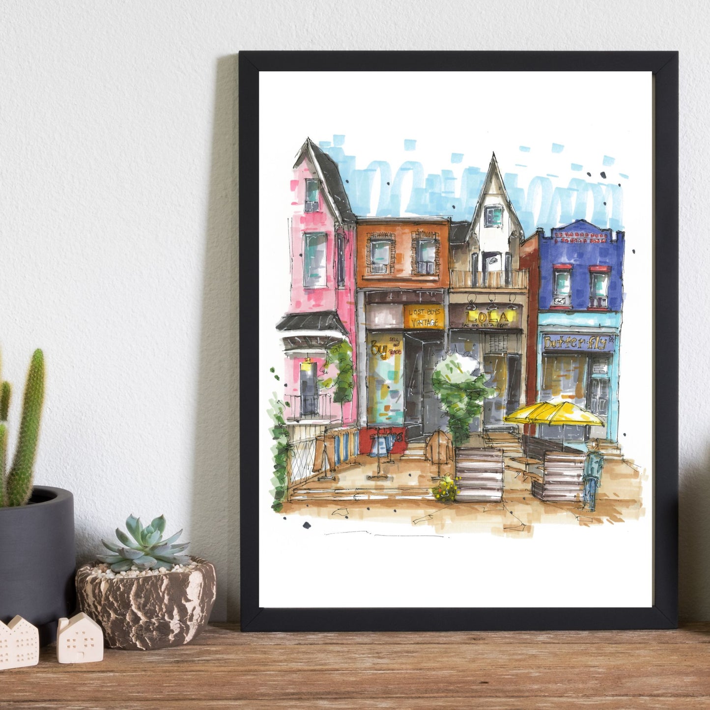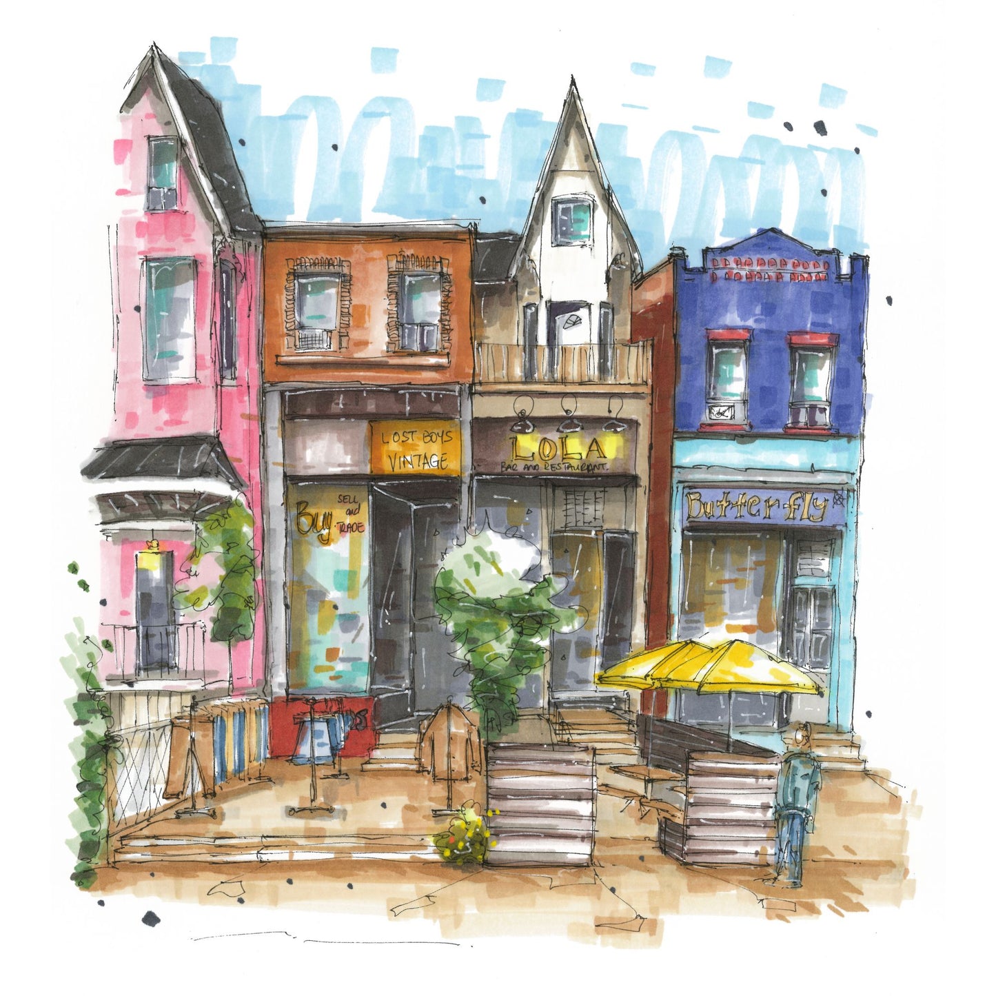 In this sketch I've captured the Kensington Market in Toronto. Its a vibrant neighborhood known for its eclectic mix of shops, restaurants, and cultural diversity. The lively atmosphere is characterized by colorful murals, bustling street vendors, and the aroma of international cuisines wafting through the air. This area has evolved into a local favorite and a popular tourist destination due to its rich history and unique character.