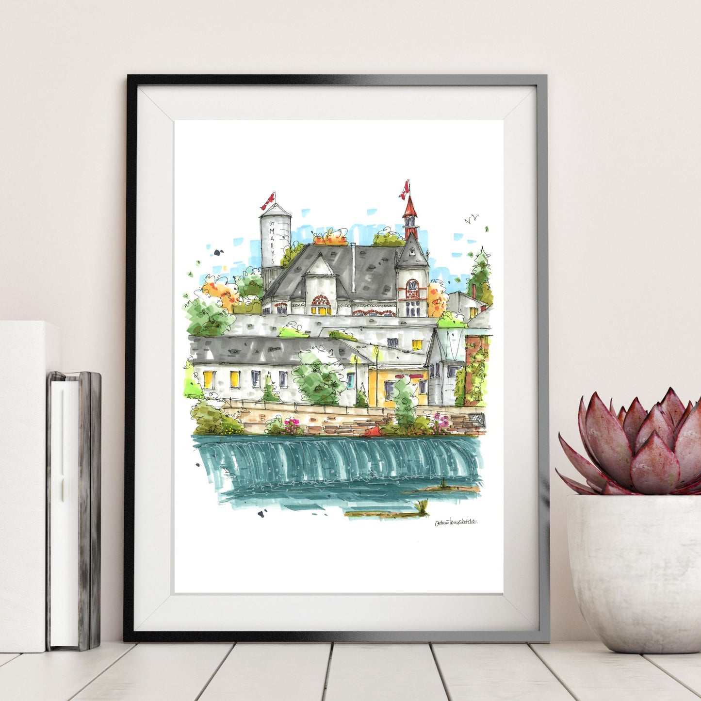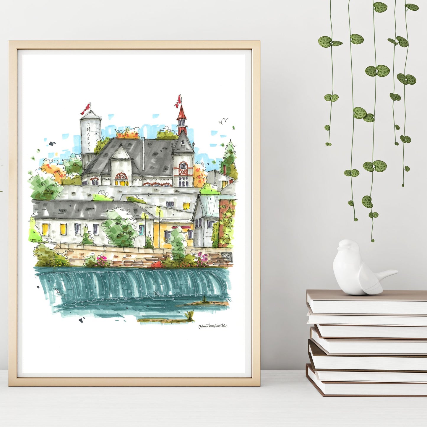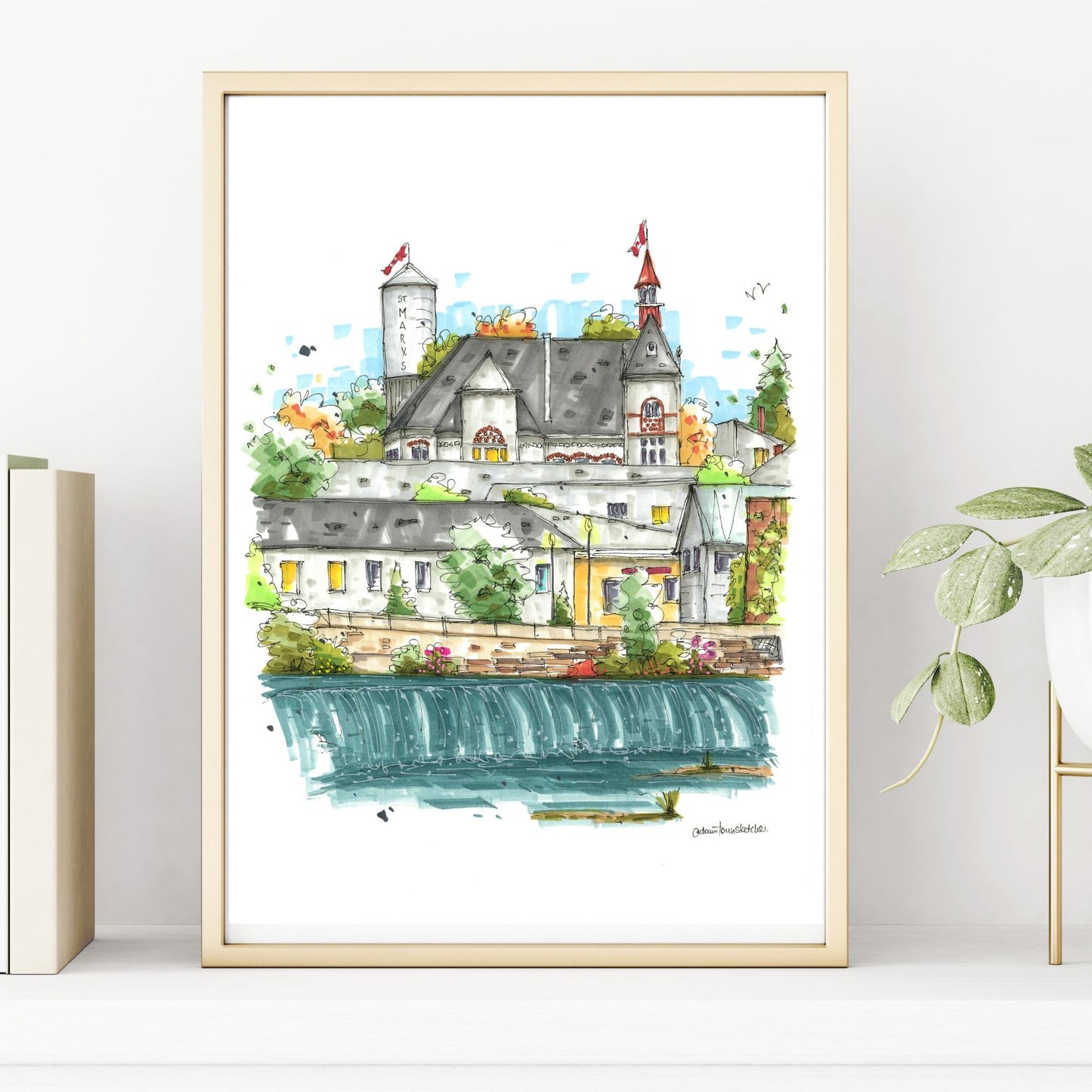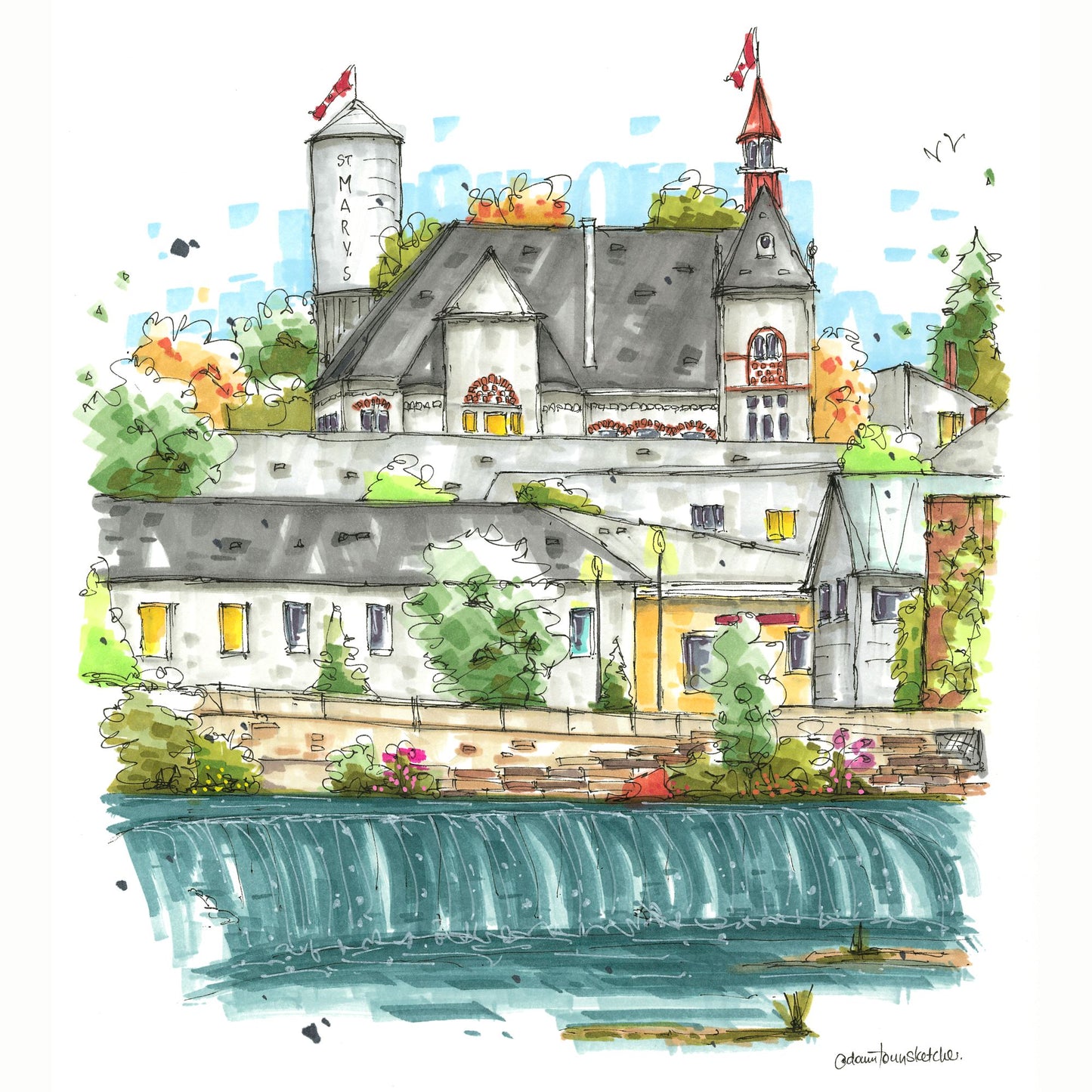 The sketch of Little Falls in St. Marys, Ontario, captures the charm of this historic town and its natural landmark. Little Falls is a serene cascade along the Thames River, surrounded by the rich history and limestone architecture that define St. Marys.