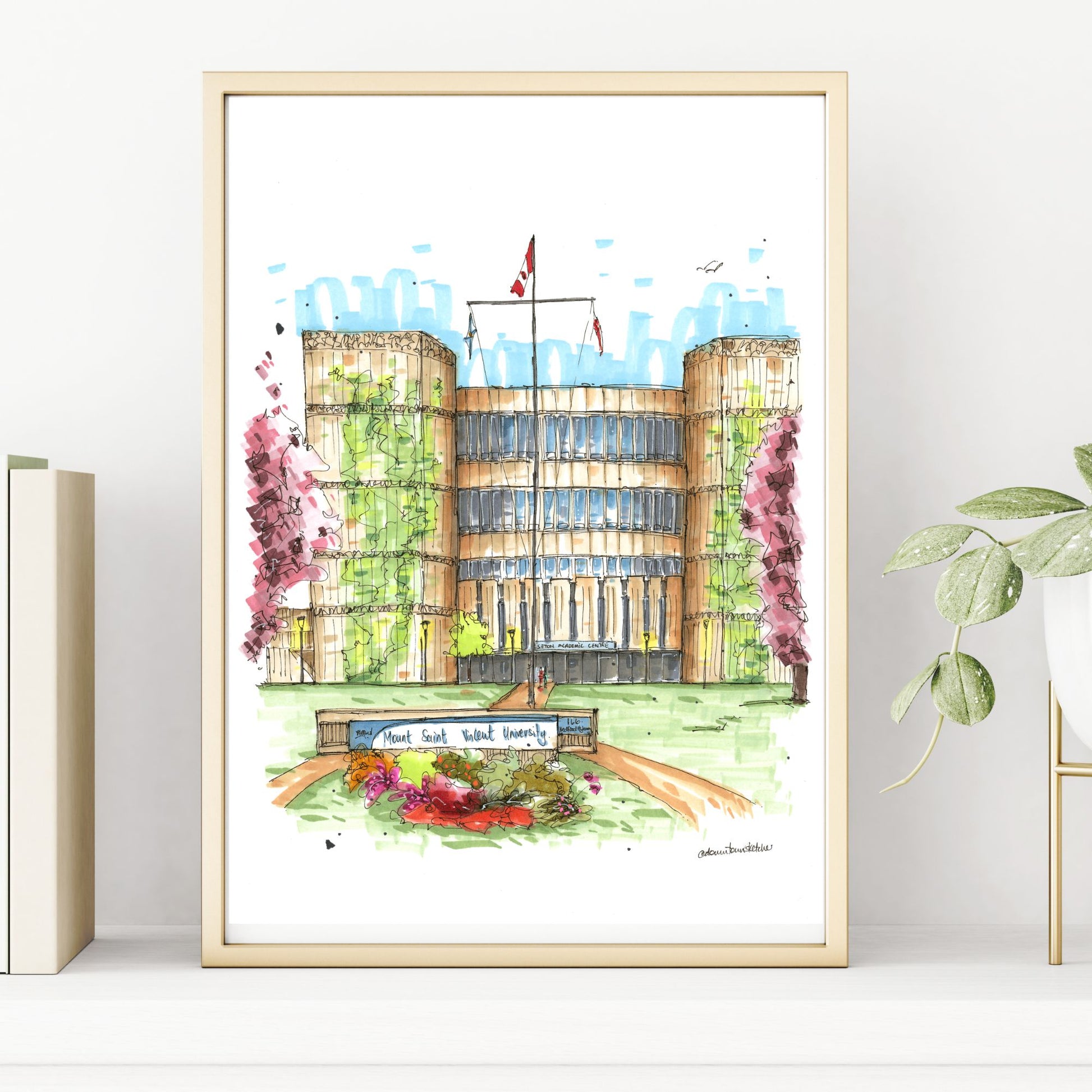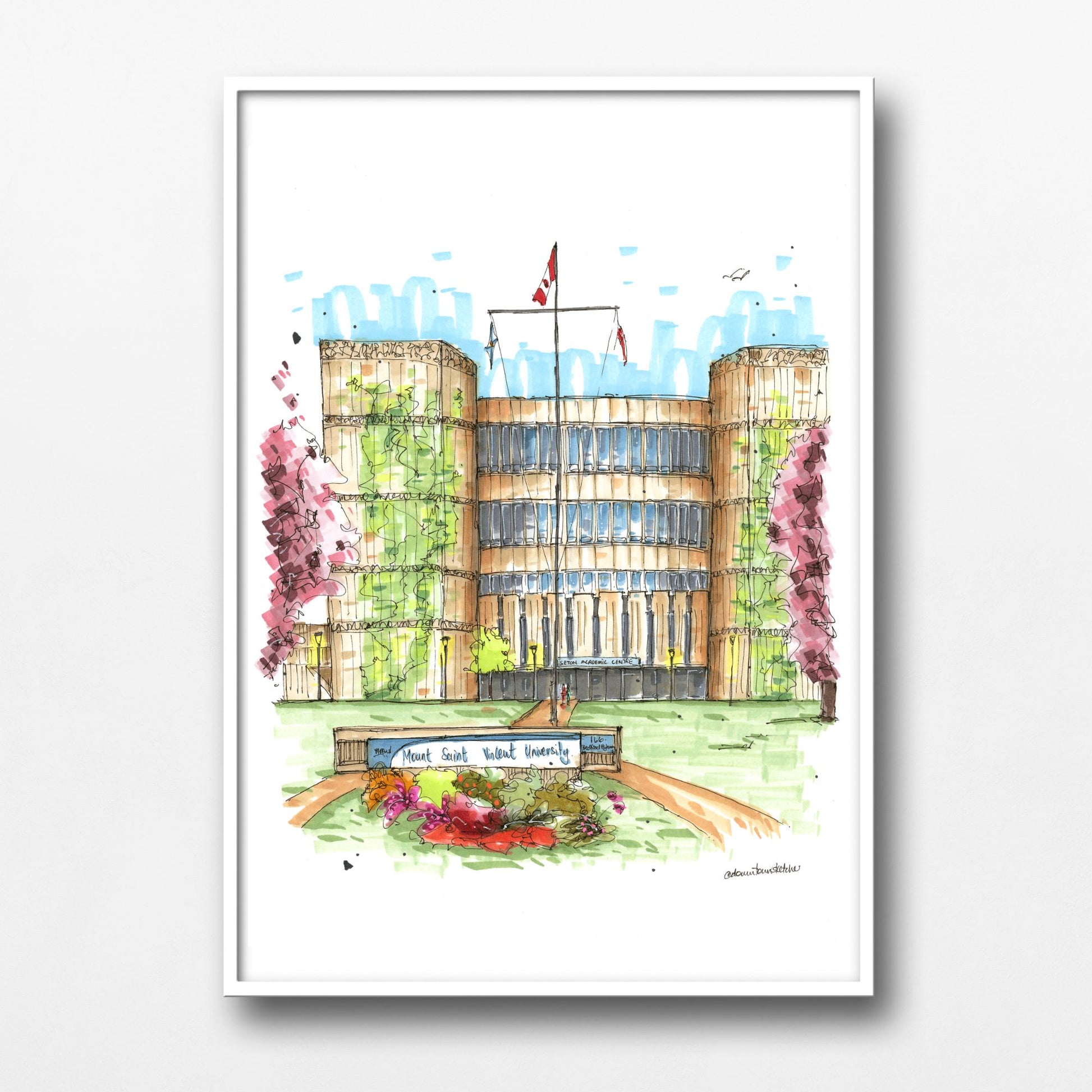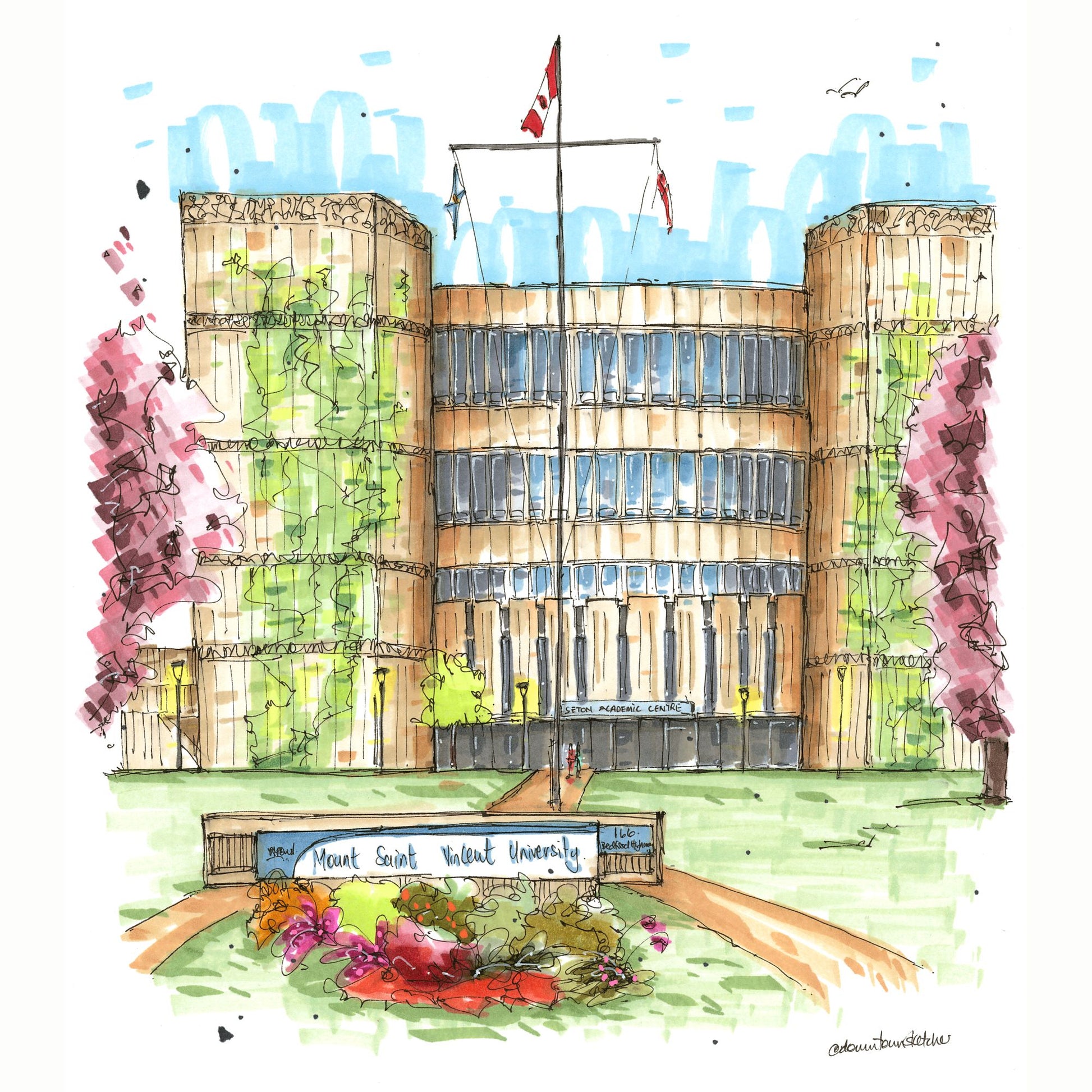 This sketch beautifully captures Mount Saint Vincent University (MSVU), a historic institution perched in Halifax, Nova Scotia. Founded in 1873 by the Sisters of Charity, MSVU has a long-standing commitment to social justice and the advancement of women. The sketch highlights the university's distinctive architecture, blending historic buildings with modern facilities, all set against the backdrop of the Halifax landscape.