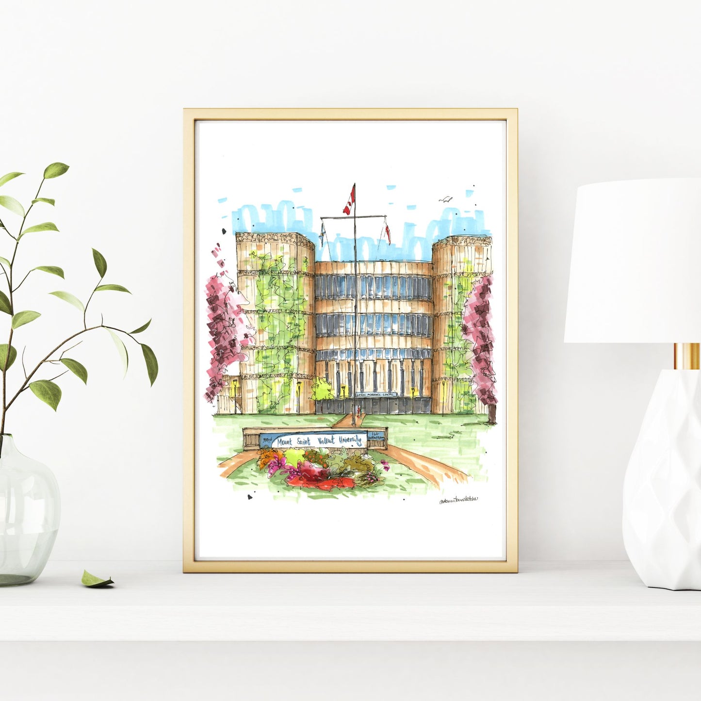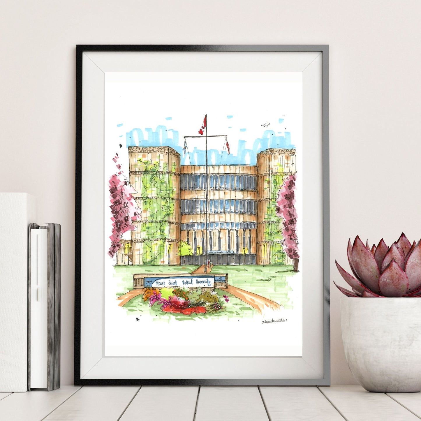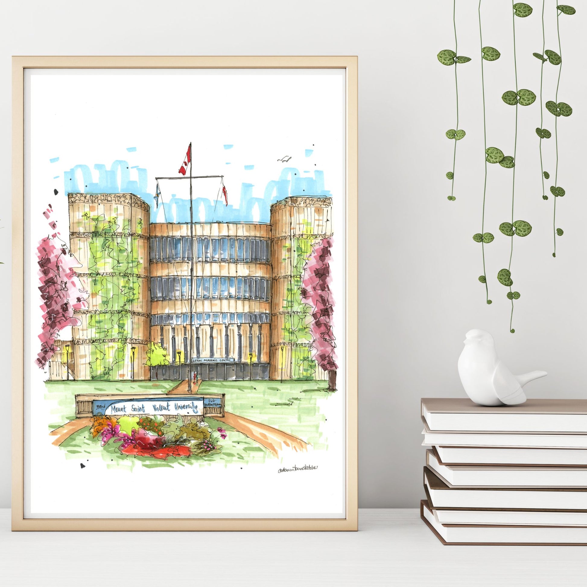 This sketch beautifully captures Mount Saint Vincent University (MSVU), a historic institution perched in Halifax, Nova Scotia. Founded in 1873 by the Sisters of Charity, MSVU has a long-standing commitment to social justice and the advancement of women. The sketch highlights the university's distinctive architecture, blending historic buildings with modern facilities, all set against the backdrop of the Halifax landscape.