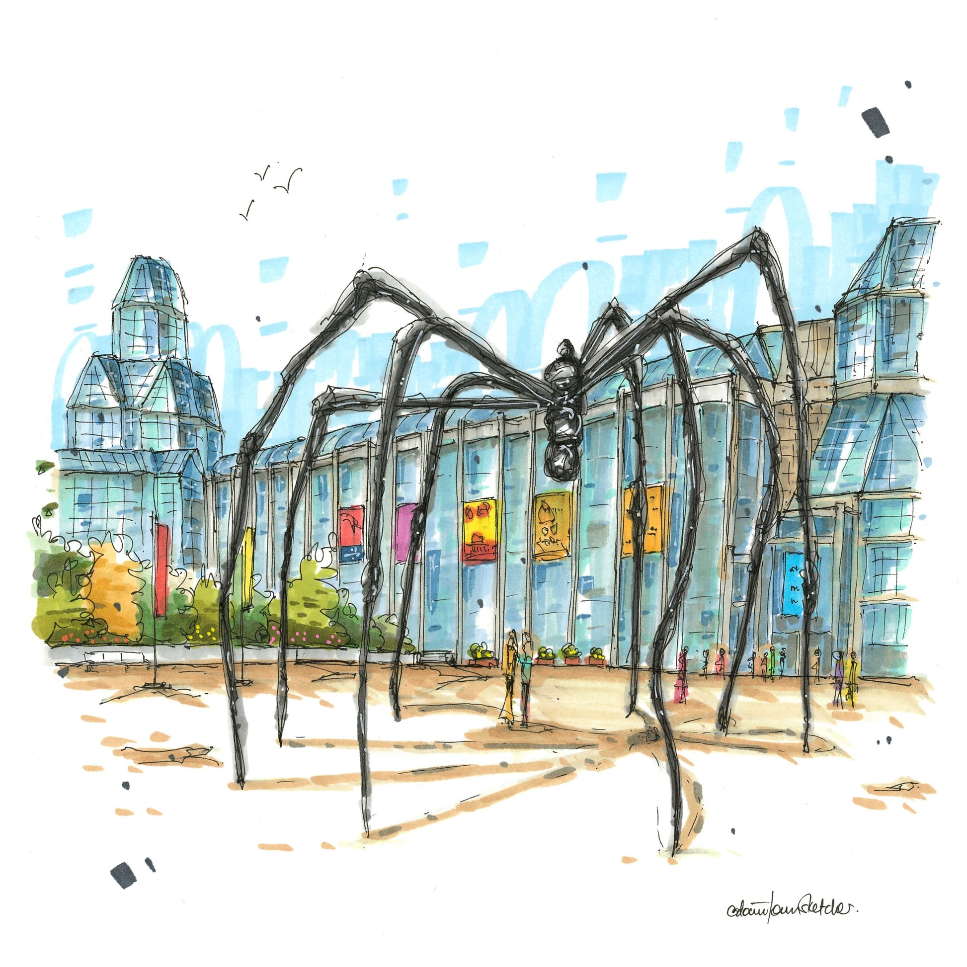 The sketch, available as a greeting card, features the iconic "Maman" spider sculpture in the foreground, with the National Gallery of Canada rising behind it. The National Gallery of Canada, established in 1880, is showcased with attention to its glass and stone facade. The sketch highlights its role as a repository of Canadian and international art, celebrating the nation's cultural heritage.