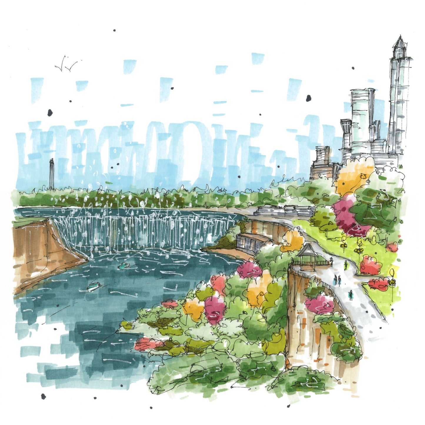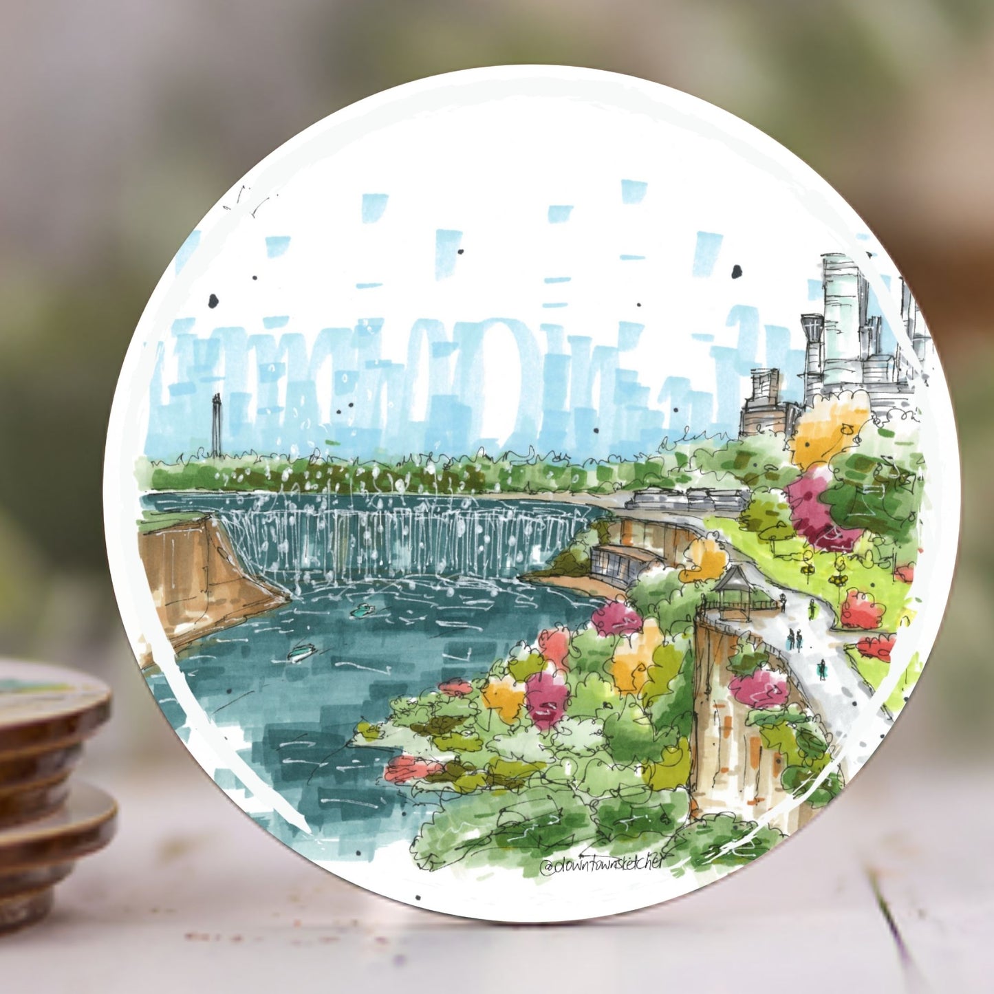 The sketch on this coaster is of Niagara Falls captures the awe-inspiring beauty and raw power of one of North America's most iconic natural wonders.