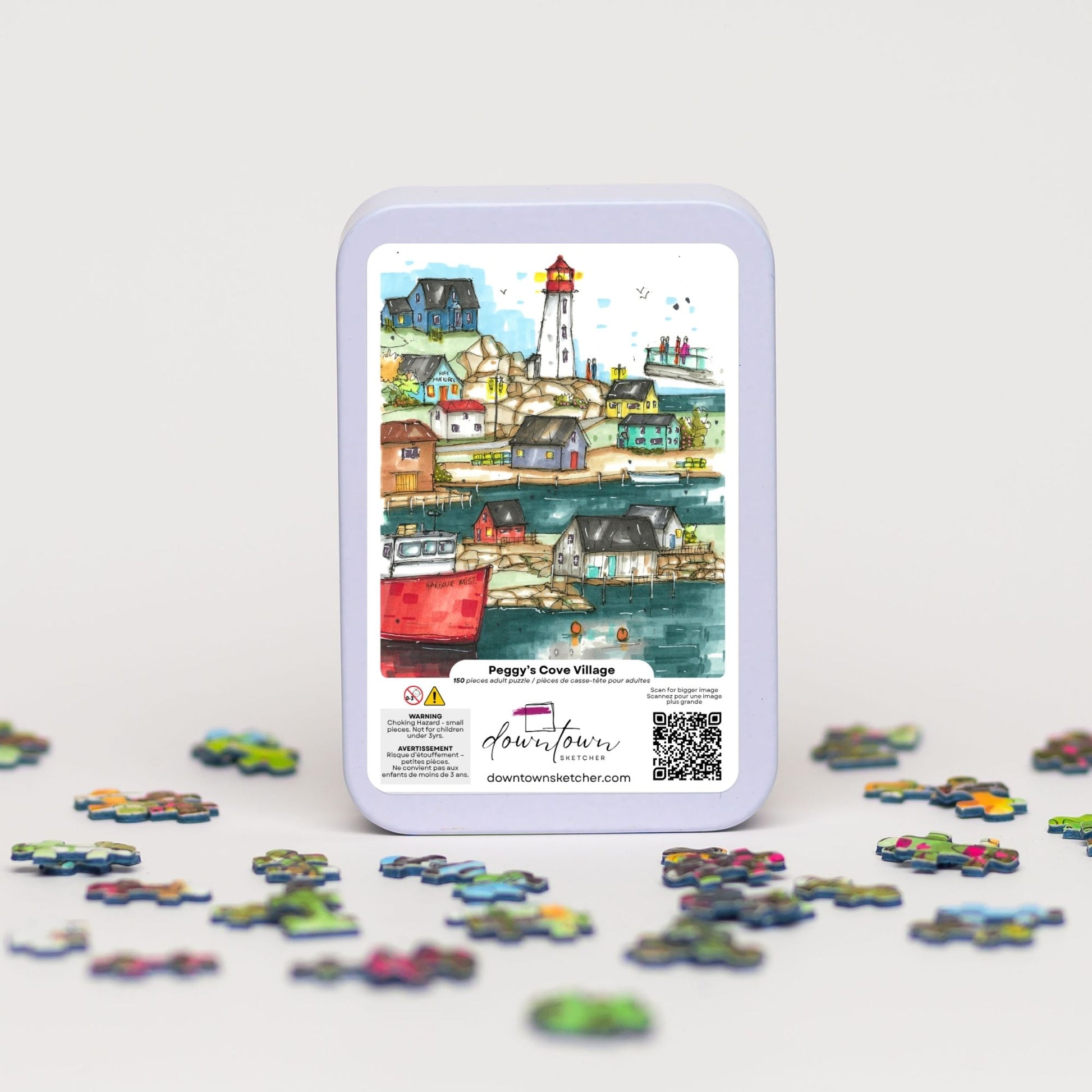 Capture the essence of one of Nova Scotia’s most beloved coastal communities with the Peggy’s Cove Village Mini Luxury Puzzle. This intricate collage celebrates the iconic Peggy’s Cove Lighthouse, perched atop rugged granite and guiding sailors since 1915, now hailed as the most photographed lighthouse in Canada. As you explore the puzzle, you’ll also uncover the charm of Peggy’s Cove village itself—complete with its quaint, colourful cottages, the welcoming Harbour Mist fishing boat, and the whimsical Holy Mackerel Gift Shop that reflects the spirit of local hospitality and artistry.