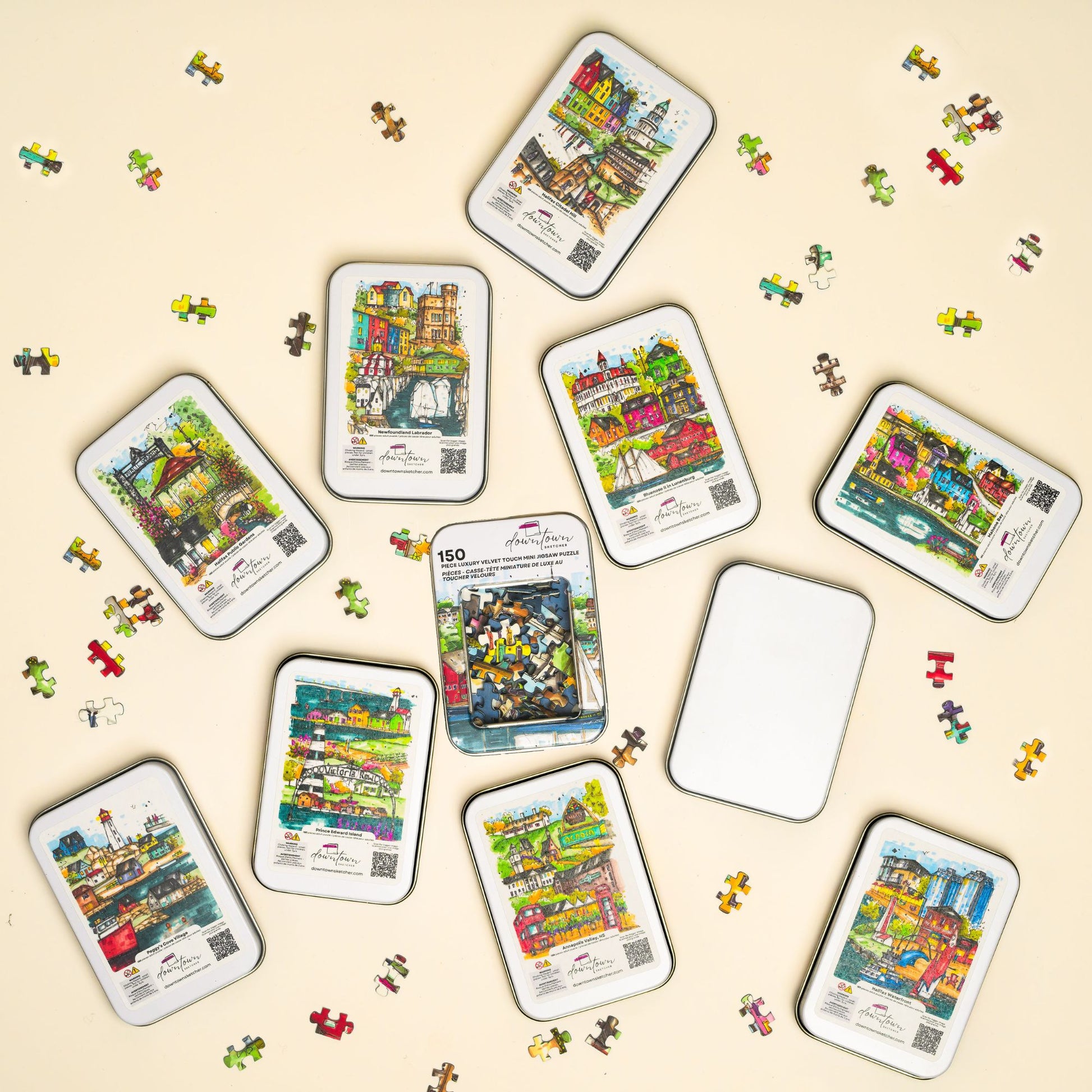 Crafted with luxurious blue core material and a refined linen finish, every puzzle piece offers a satisfying, tactile experience. Presented in a sleek tin travel case with a window, this mini puzzle is perfect for display, gifting, or as a portable keepsake for locals and visitors alike. Whether you’re a puzzle enthusiast or a lover of Halifax’s unique history, this mini puzzle invites you to relive the city’s most cherished landmarks, piece by piece.