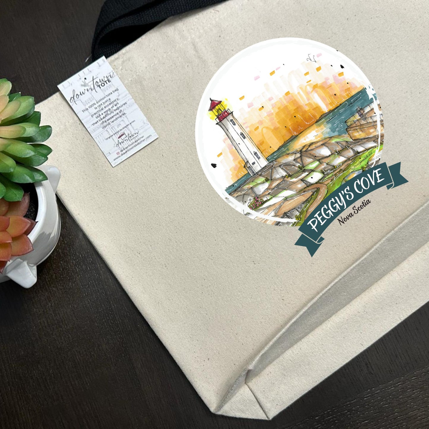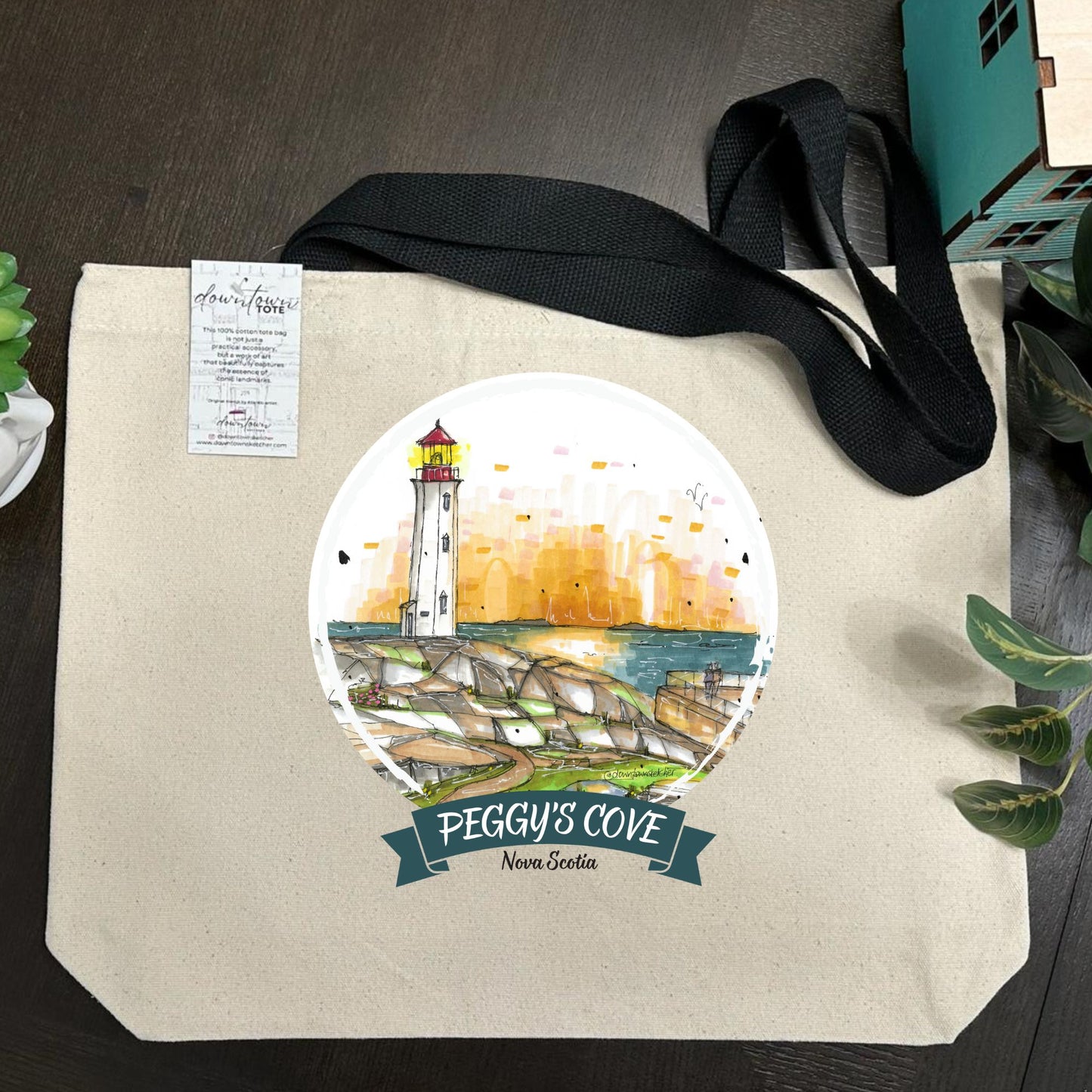 A tote bag featuring an artwork sketch of Peggy's Cove Lighthouse is located in Nova Scotia, Canada, and is one of the most photographed lighthouses in the world. It was built in 1915 to improve navigation in the area and is still an active lighthouse today.