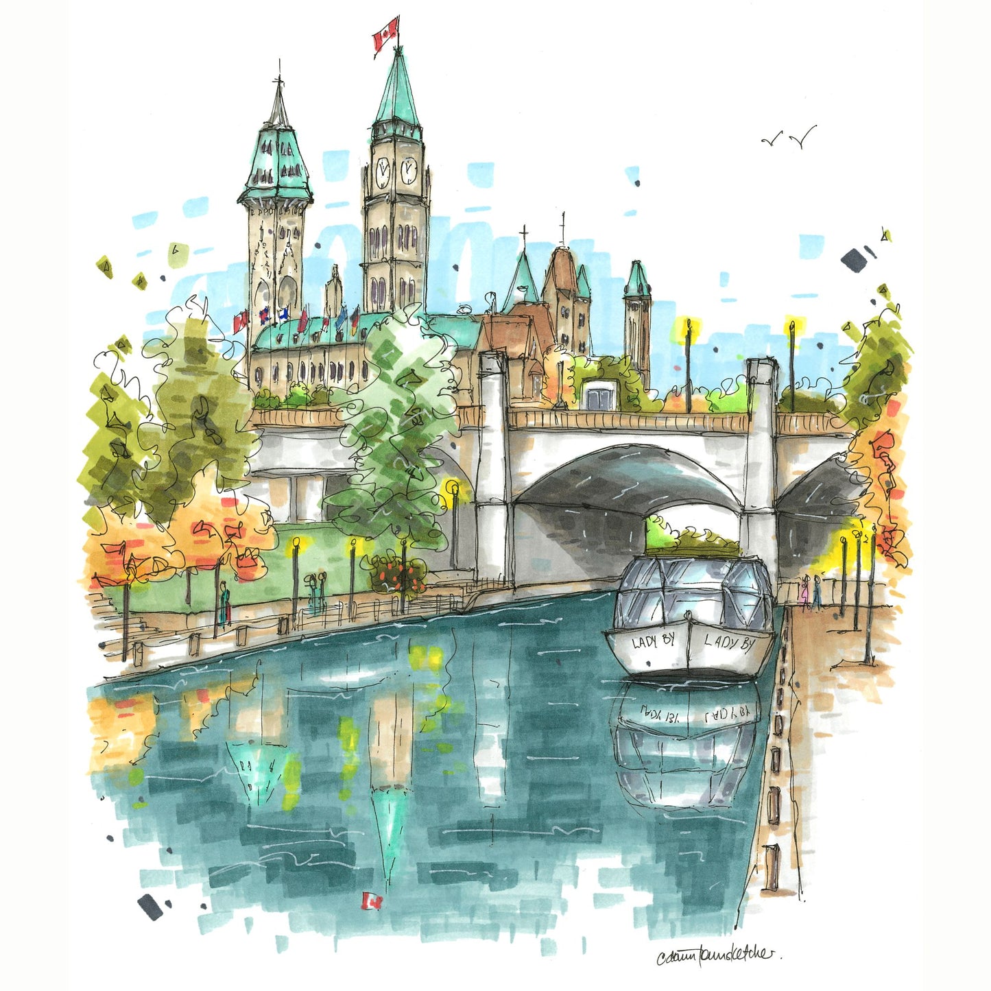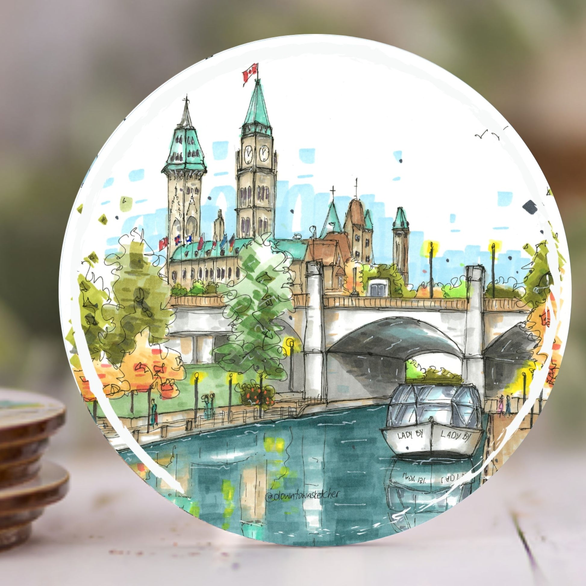 The sketch, available as a coaster, captures the essence of Ottawa, the vibrant capital of Canada, with the Rideau Canal and Parliament Buildings as its focal points. Ottawa, situated in southeastern Ontario, is a city rich in history and culture, serving as the nation's capital since 1867. The city's strategic location between Toronto and Montreal, along with its access to the Ottawa River, made it an ideal choice for the capital due to its central position and connectivity.