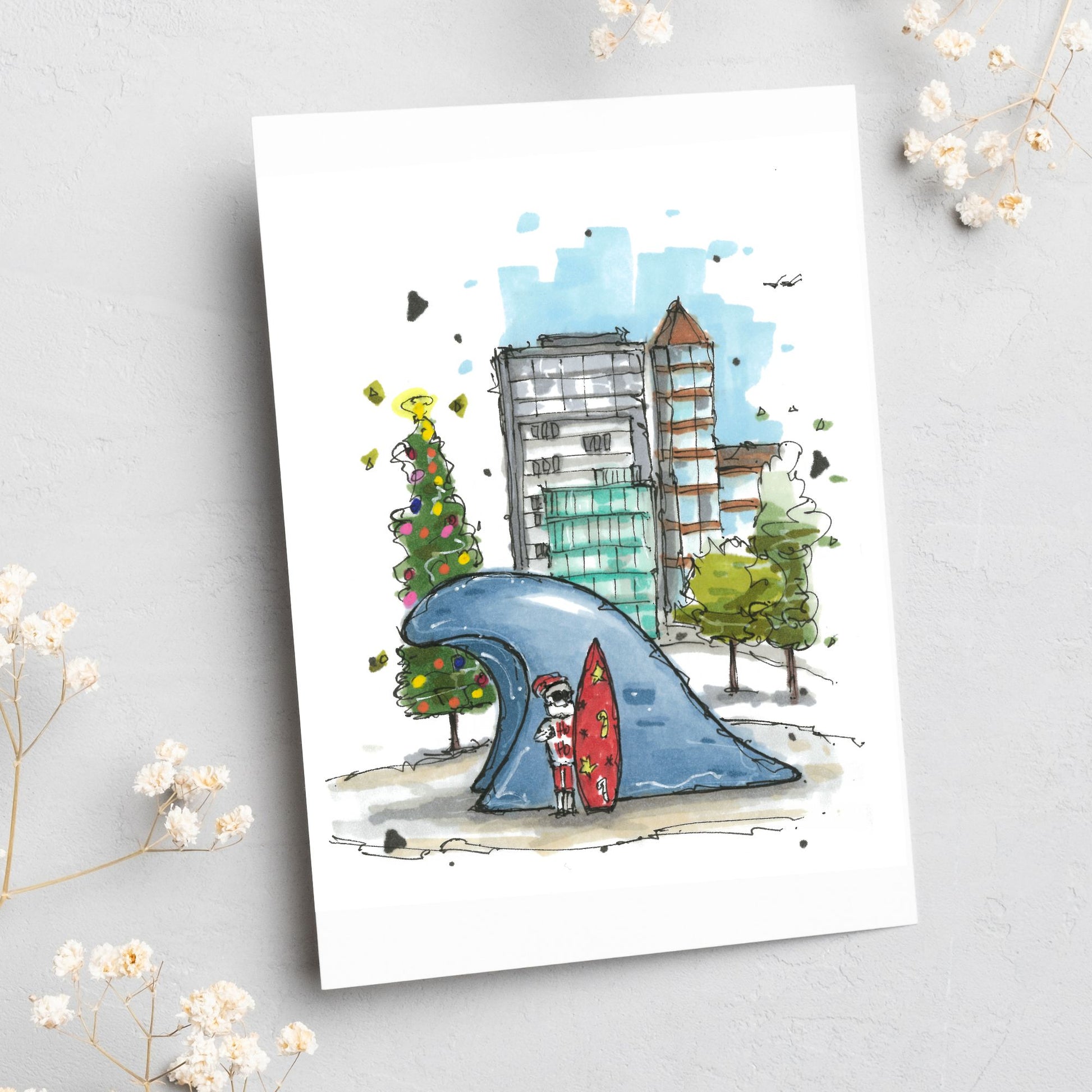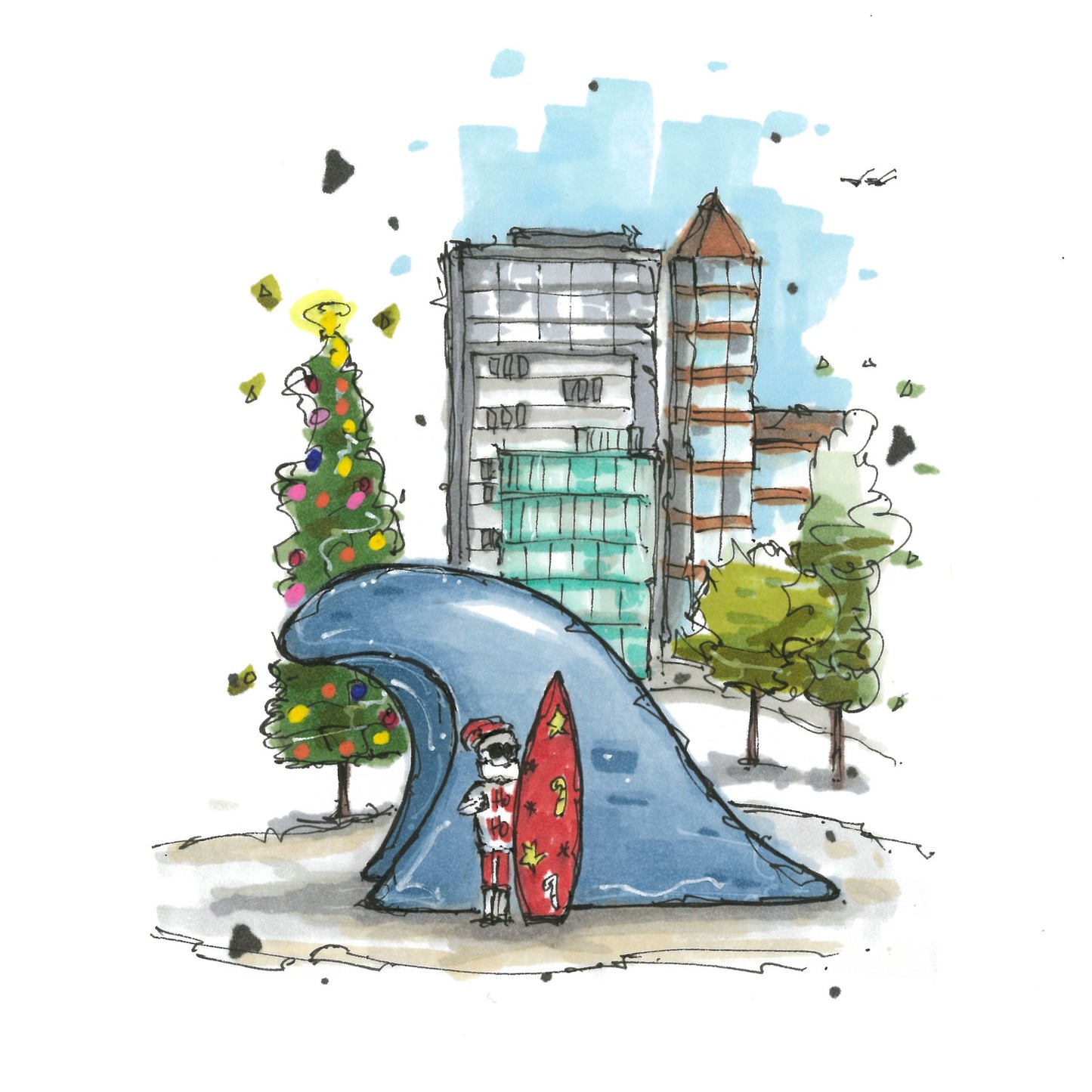 This Christmas card featuring Santa Claus standing in front of The Wave on the Halifax Waterfront would capture a delightful blend of holiday cheer and local maritime culture. The Wave, officially known as "Halifax Wave," is a prominent art installation located on the Halifax Waterfront.