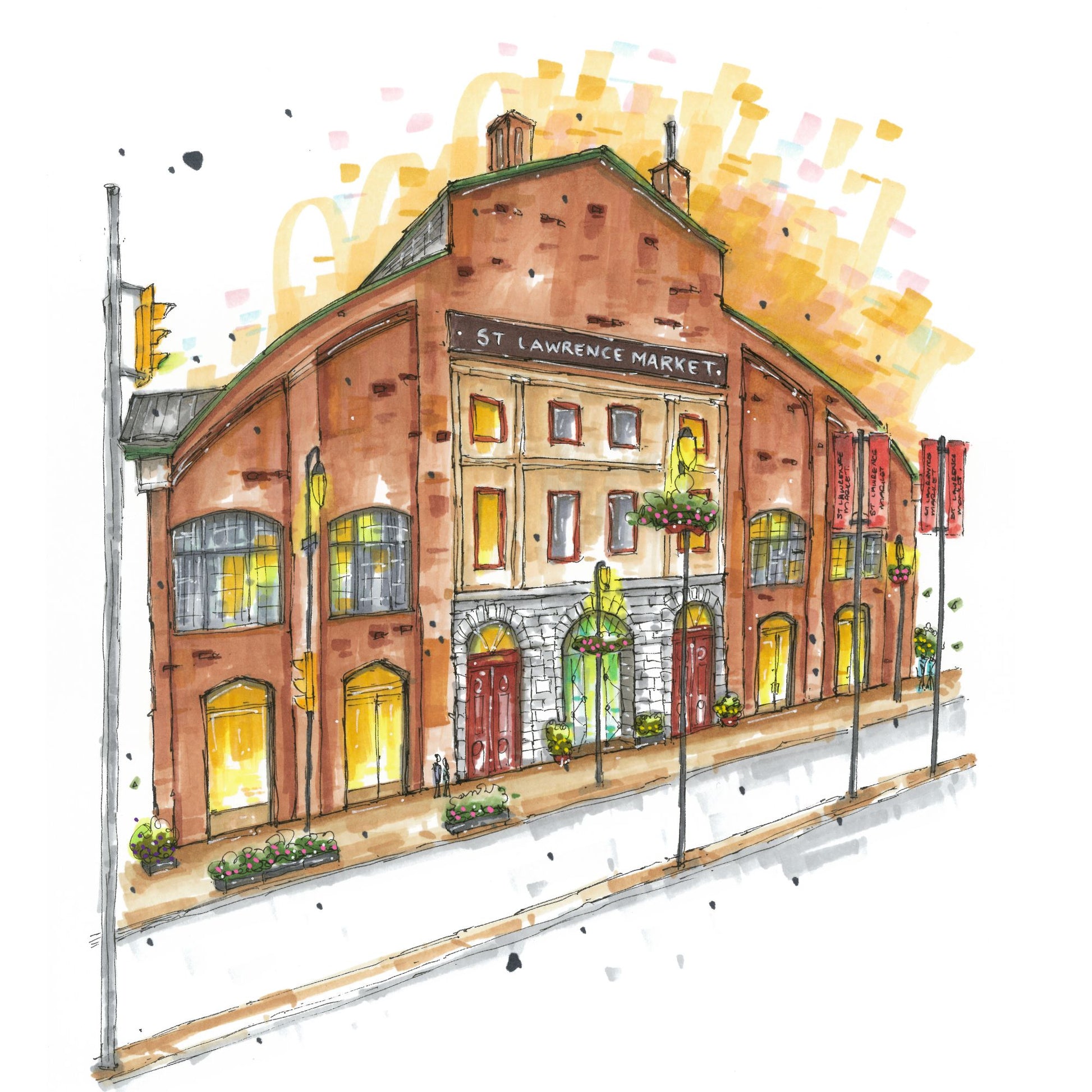This sketch on this coaster is of the St. Lawrence Market, a historic landmark and vibrant public market located in the heart of Old Town Toronto, at 92-95 Front Street East. The market complex consists of three main buildings: the South Market, the North Market, and St. Lawrence Hall.
