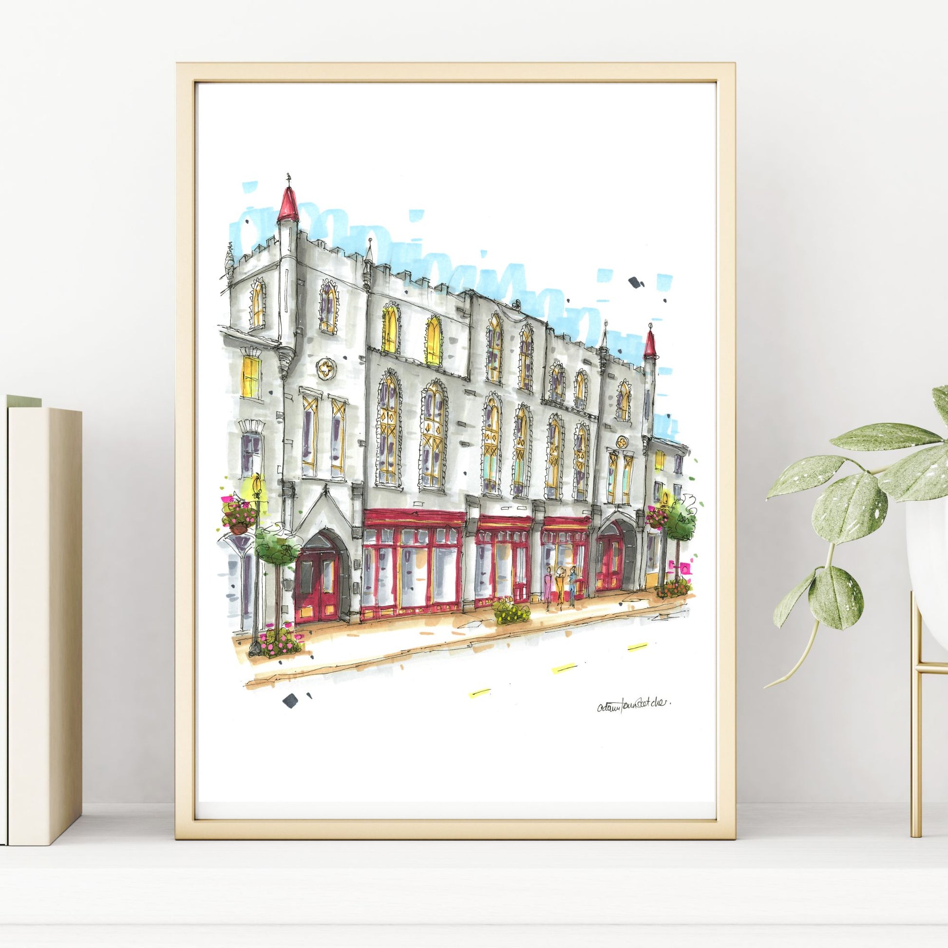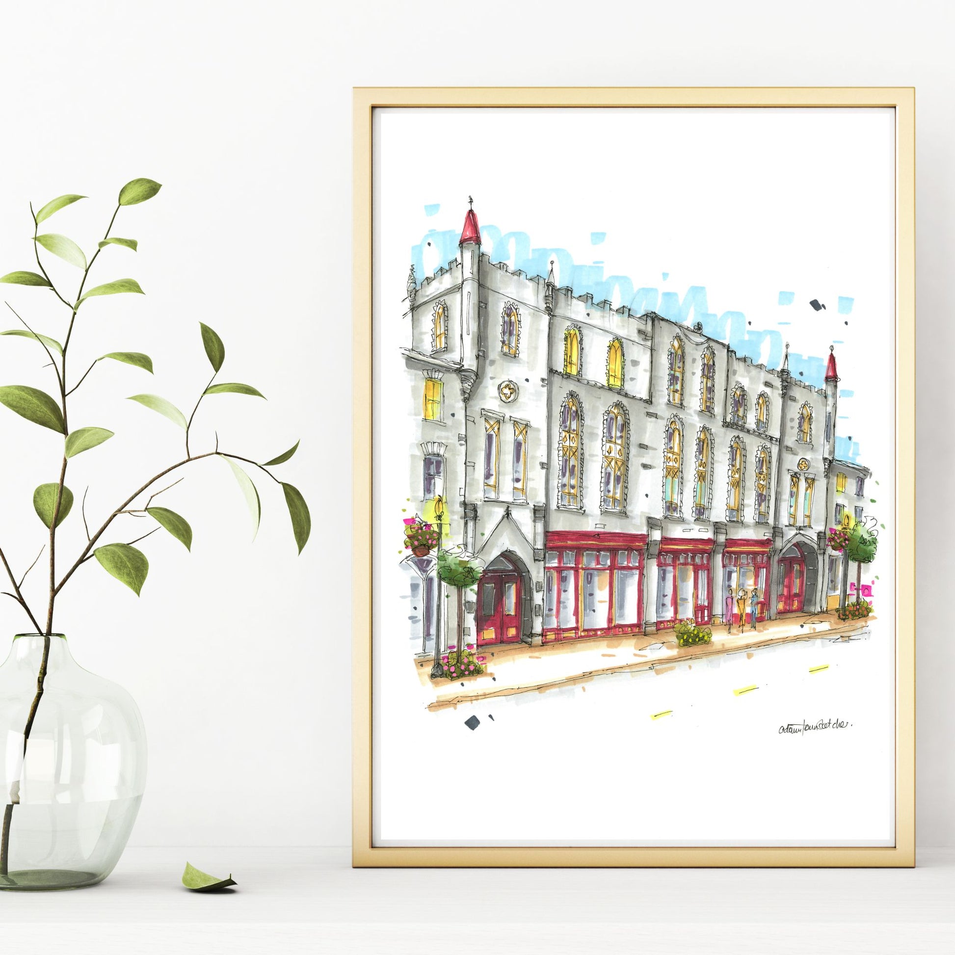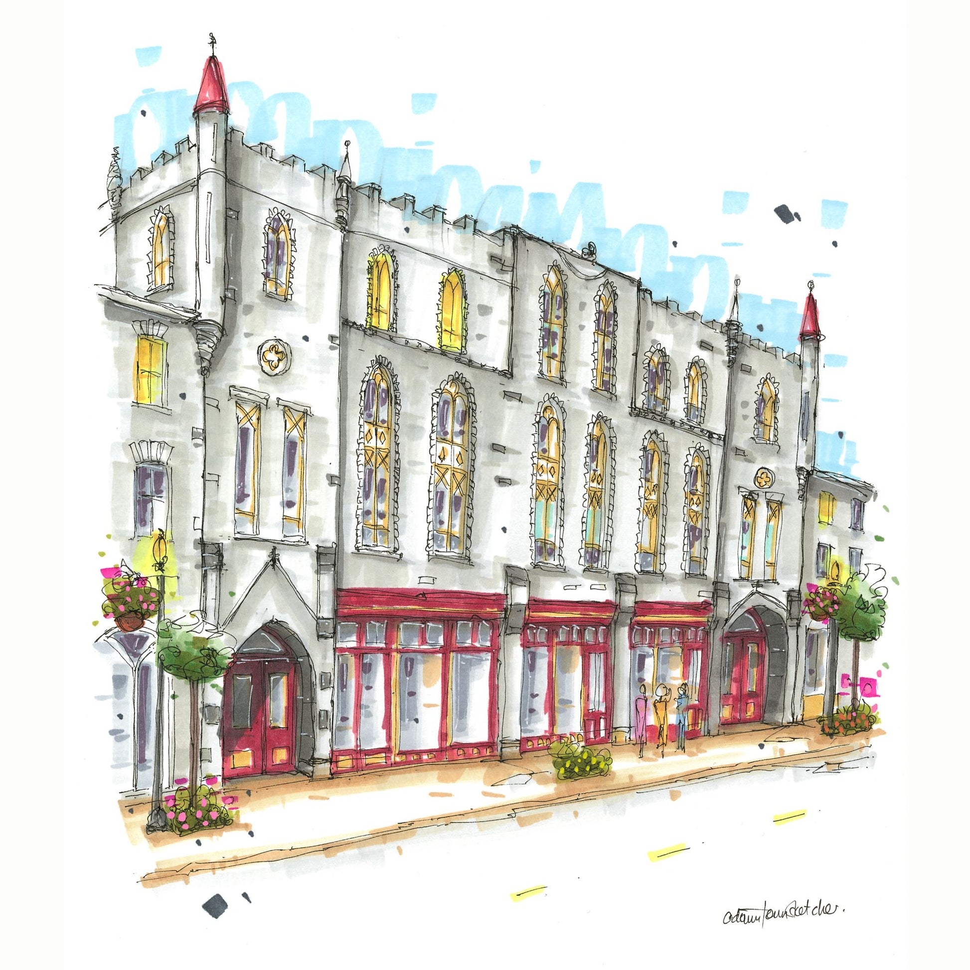 The sketch captures the historic charm of the St. Marys Opera House, situated in the heart of St. Marys, Ontario. The building, constructed between 1879 and 1880, is a testament to Gothic Revival architecture, featuring intricate limestone details and a highly ornamental facade. Its eclectic blend of architectural styles, including Scottish Baronial and castellated Medieval motifs, makes it a unique landmark in the town.