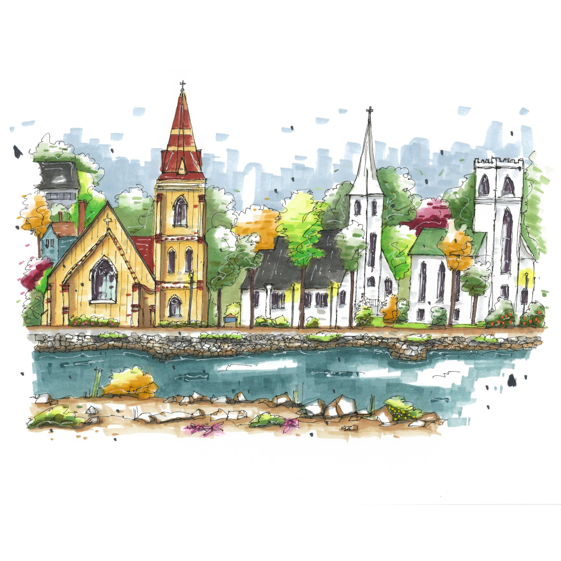 This coaster features the historic Three Churches of Mahone Bay, including St. James’ Anglican, St. John’s Evangelical Lutheran, and Trinity United Churches, which stand side by side along the coast, showcasing their architectural harmony and rich history dating back to 1869, 1887, and 1923 respectively.