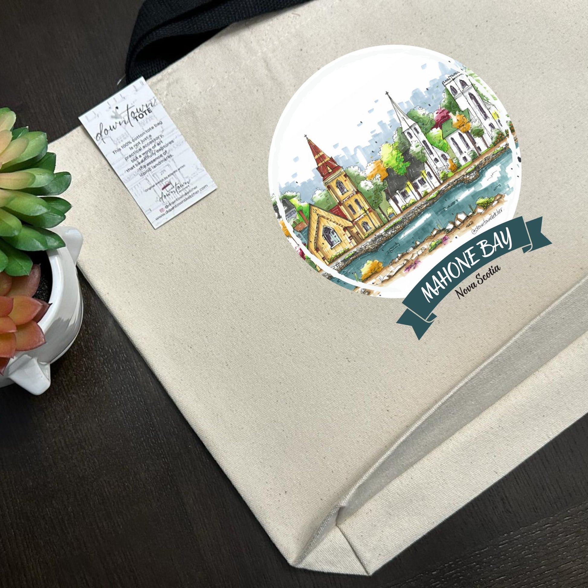 A tote bag featuring an artwork sketch of Mahone Bay's famous three churches captures the essence of this picturesque location in Nova Scotia. The sketch showcases the unique charm of Mahone Bay with intricate details and artistic flair.