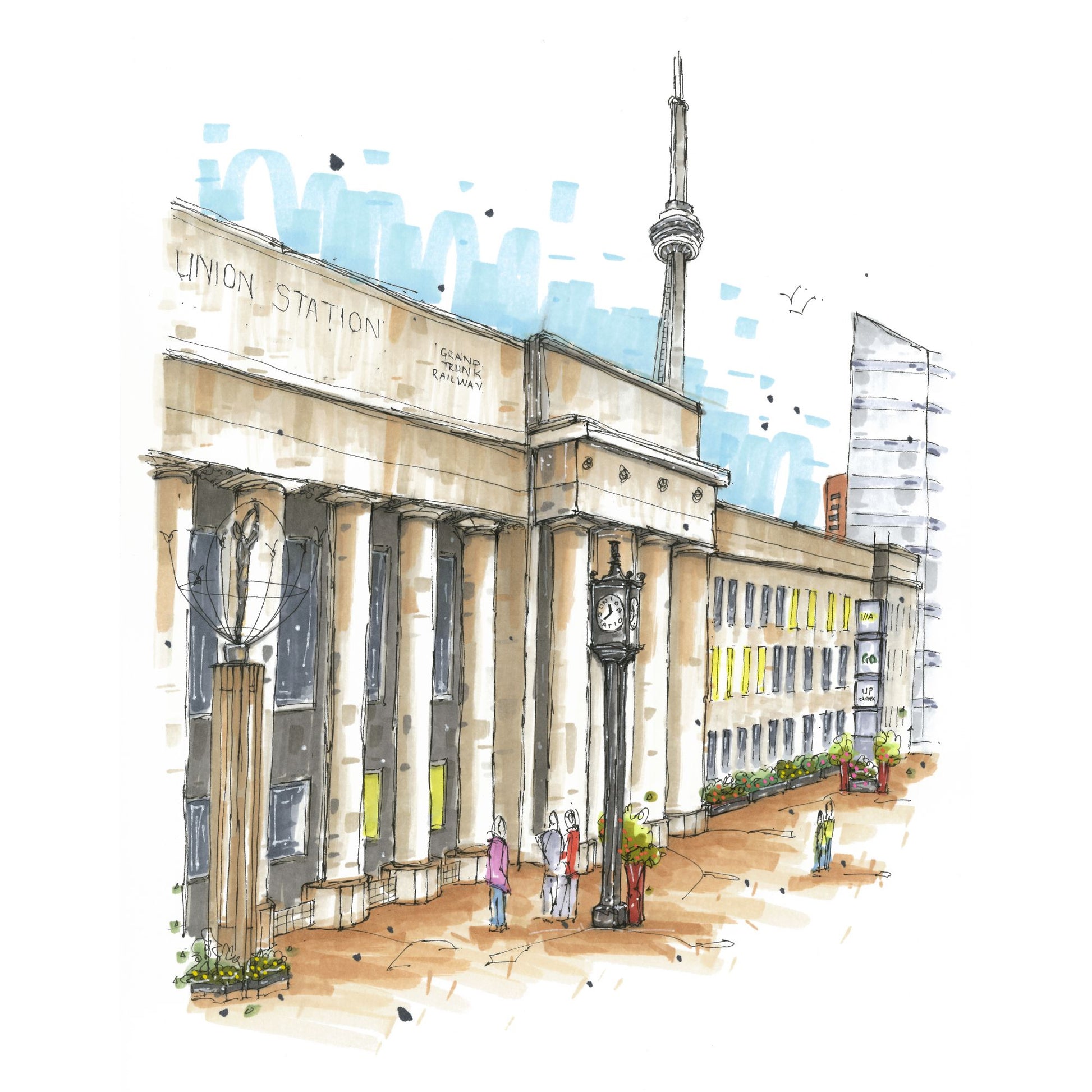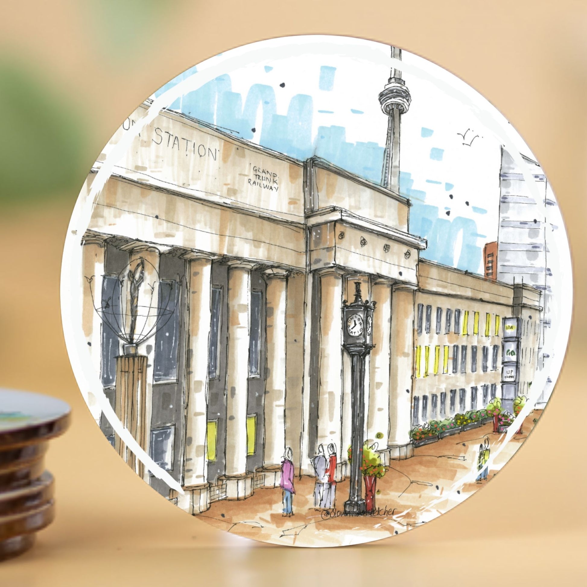 The sketch on this coaster depicts Union Station, a major railway station and intermodal transportation hub in downtown Toronto. Located at 65 Front Street West, between Bay Street and York Street in the city's Financial District, it's a prominent landmark in Toronto's urban landscape.